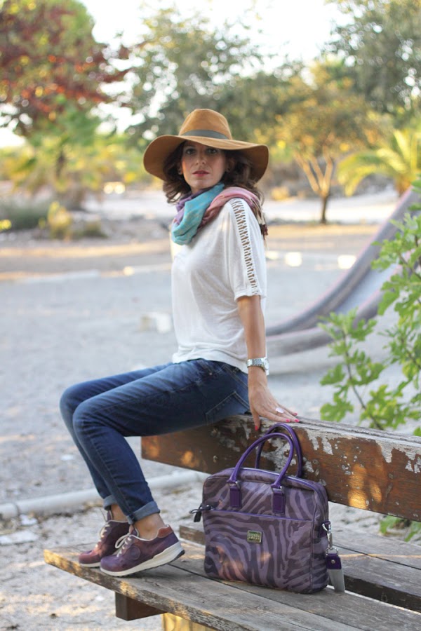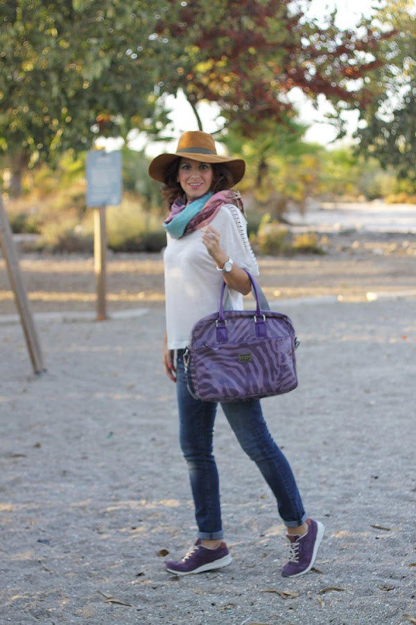 Although on many occasions I wear with skirts, today I combine with jeans, white shirt with ripped arm, scarf, hat and purse in the same tone of Scada Sport. Hope you have a nice day!
