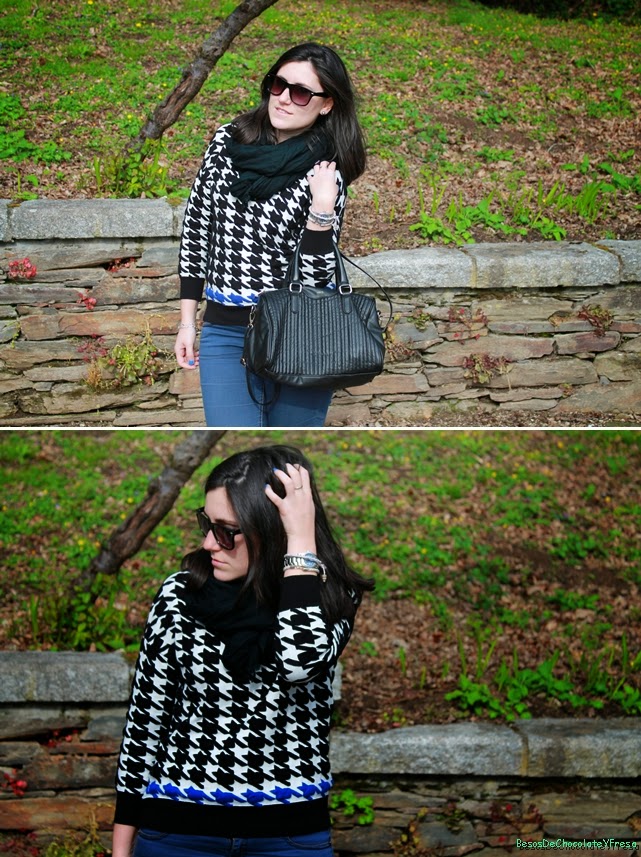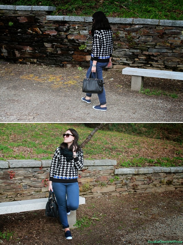 To do this I combined my navy blue and white sneakers that I had not yet taught with basic jeans and sweater with houndstooth pattern and blue note. As accessories tote bag black and black scarf.