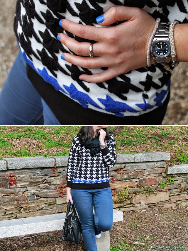 Para ello combiné mis sneakers azules marino y blancas que aún no os había enseñado, con jeans básicos y sweater con estampado de pata de gallo y nota de color azul. Como complementos bolso tote negro y foulard negro.