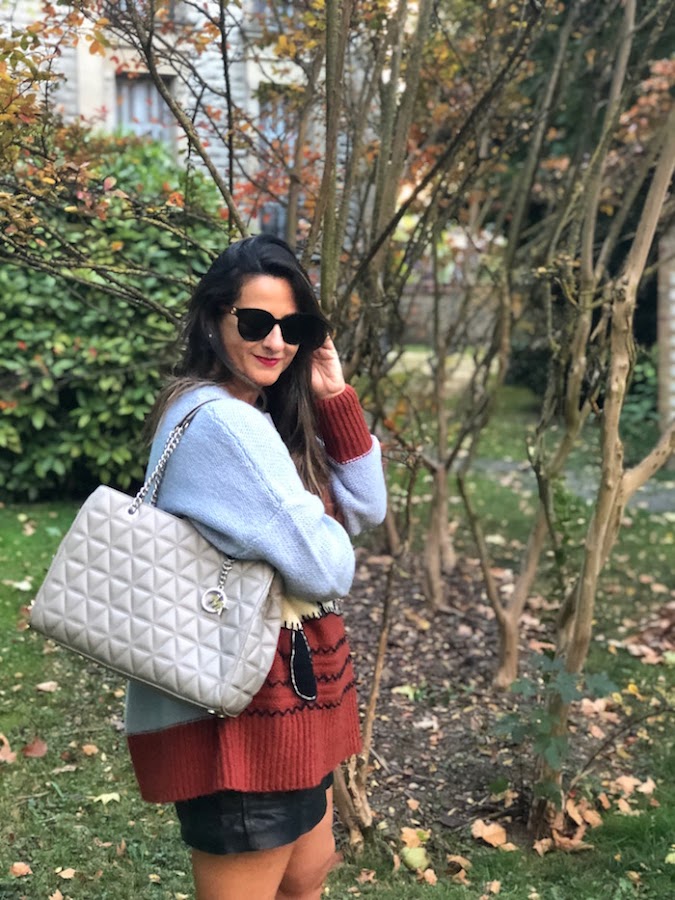 Lo combiné de nuevo con la falda negra de piel y complementos en color gris.