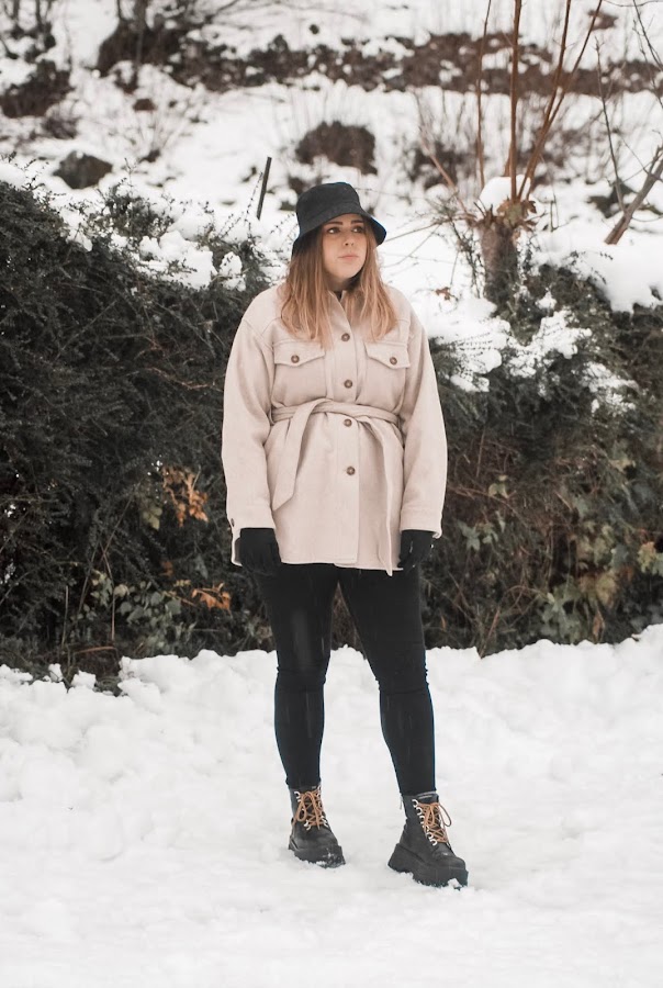 Como veis es un look super sencillo con una de mis shacket favoritas como protagonista. Para acompañarla pantalones negros super básicos y unas de mis botas favoritas del momento. Como complementos guantes para que no se me congelaran las manos y bucked hat (sombrero de pescador de toda la vida).
