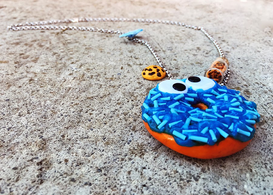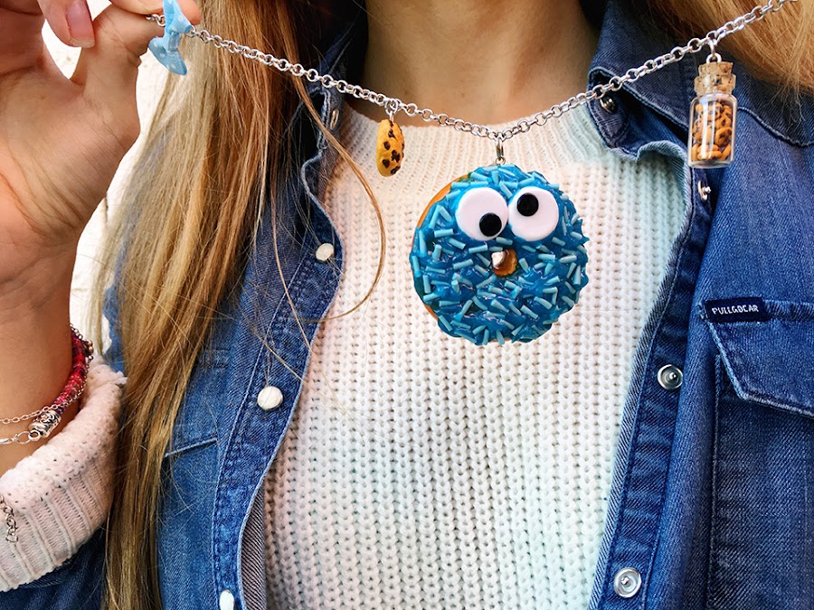 Yo he elegido un collar de donuts de monstruo de las galletas, con una galleta a un lado, un botecito lleno de cookies, y un lacito de color azul con lunares blancos, haciendo juego con mi llavero también del monstruo de las galletas. Otro de los complementos que me han encantado es la pulsera con una palmera de fresa!