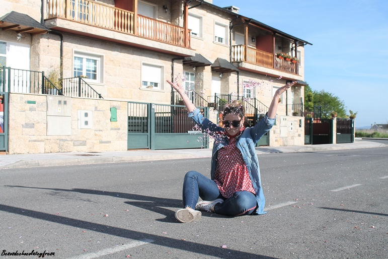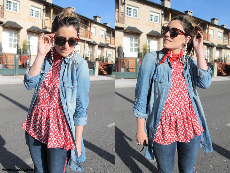 En este caso en el looks de hoy llevo la camisa denim maxi a modo de sobre camisa abierta sin abrochar como si de una chaqueta se tratase. Lo combine con jeans del mismo tono con banda lateral en rojo a juego con la blusa de gasa con estampados animales y volantes en la parte baja.