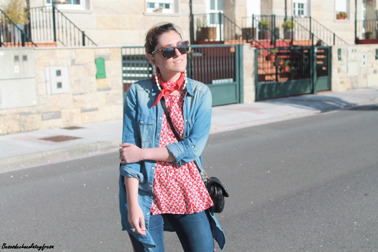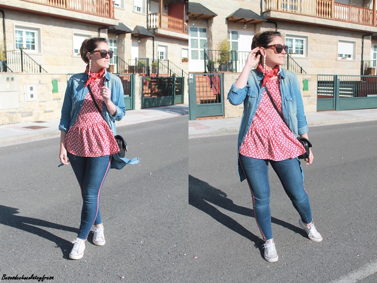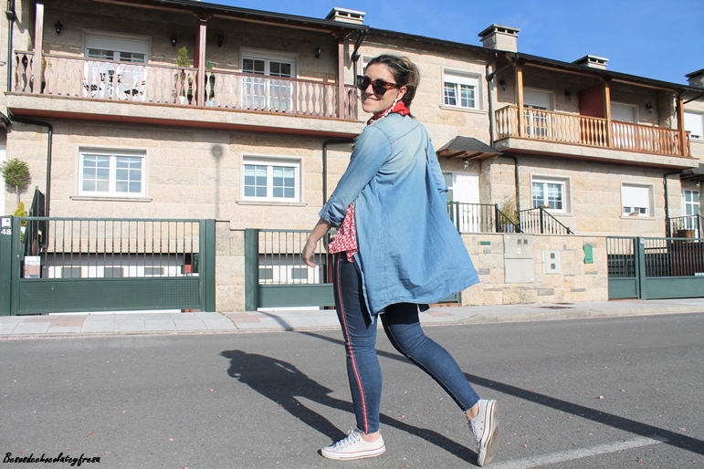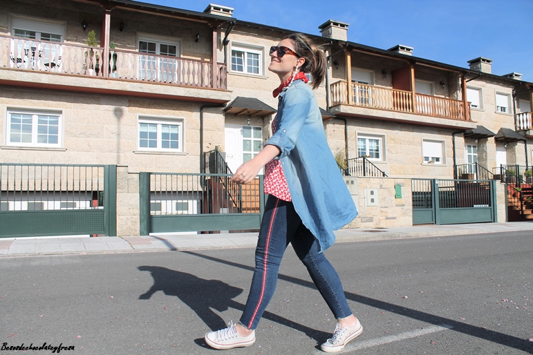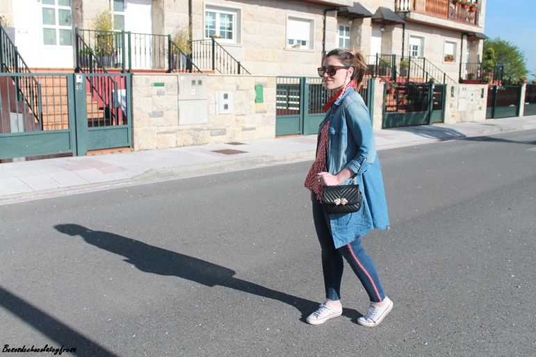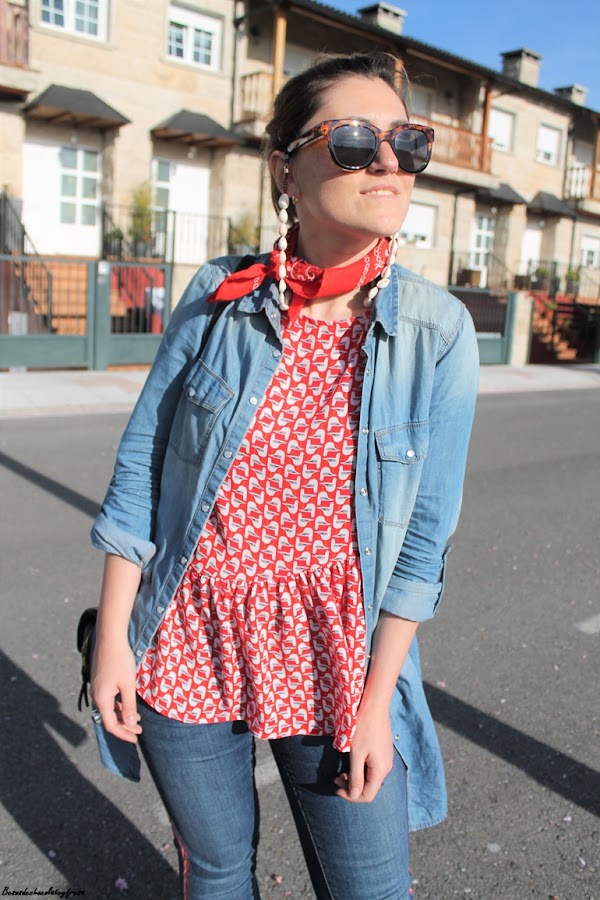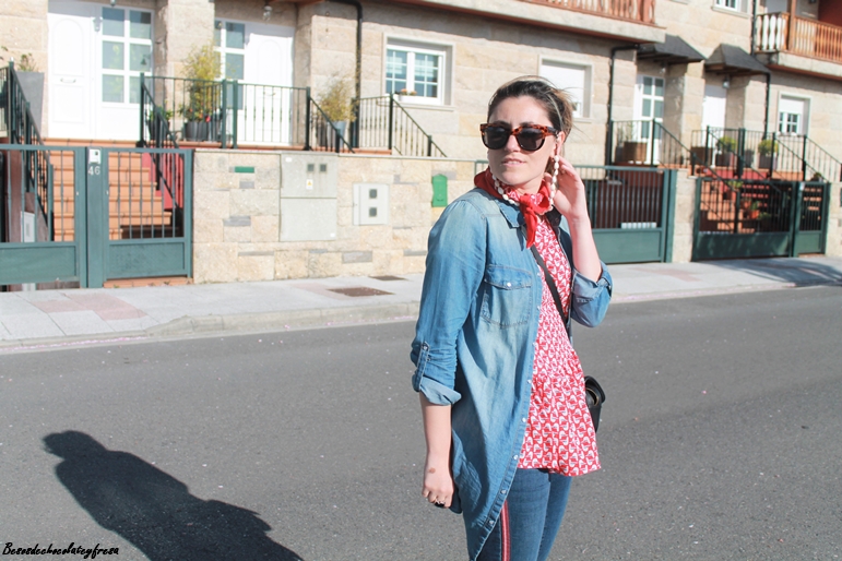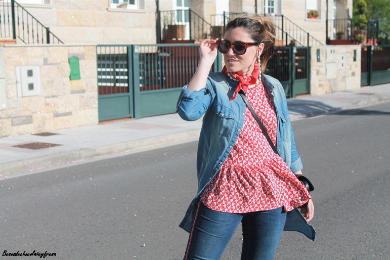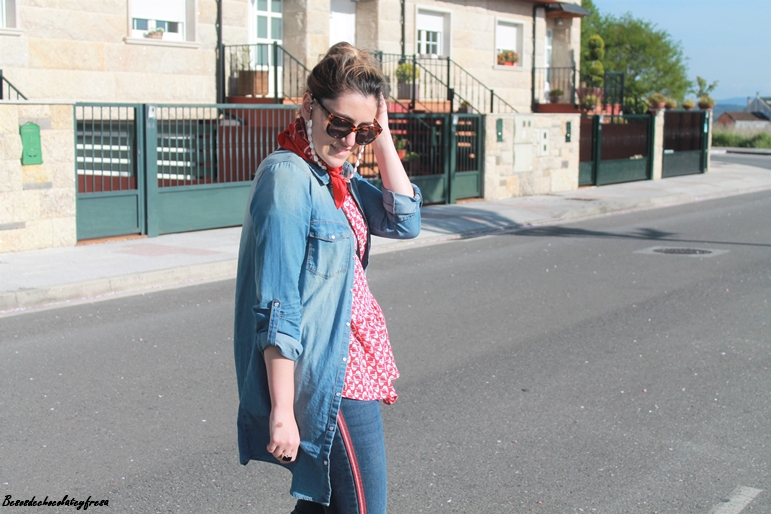 En este caso en el looks de hoy llevo la camisa denim maxi a modo de sobre camisa abierta sin abrochar como si de una chaqueta se tratase. Lo combine con jeans del mismo tono con banda lateral en rojo a juego con la blusa de gasa con estampados animales y volantes en la parte baja.