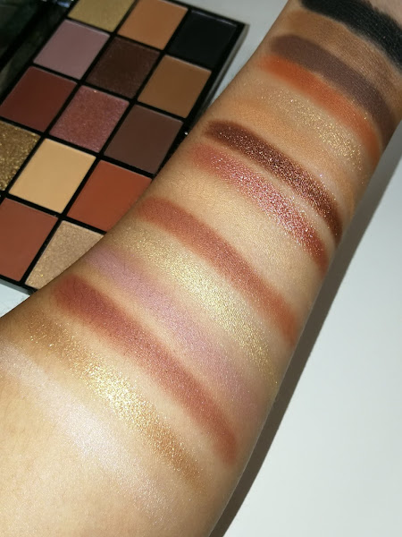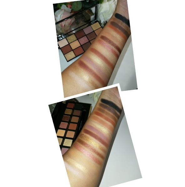 Velvet Rose contiene 15 sombras de 1.1g y Soft Glam tiene 14 sombras 0.74g . En este aspecto la paleta de Makeup Revolution gana en un tono más y la cantidad de producto también es mayor . Vamos a lo importante : los swatches .