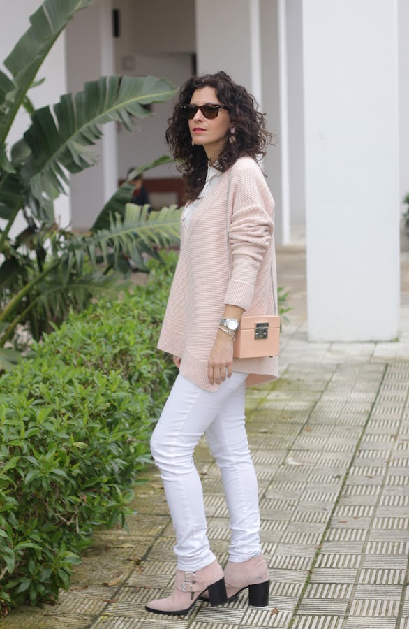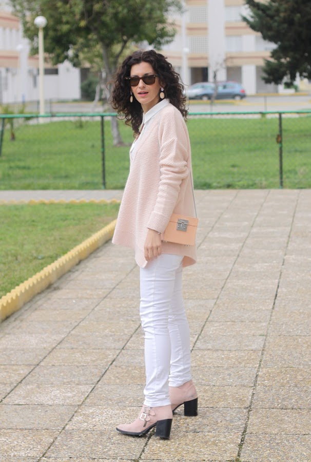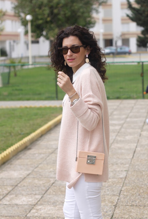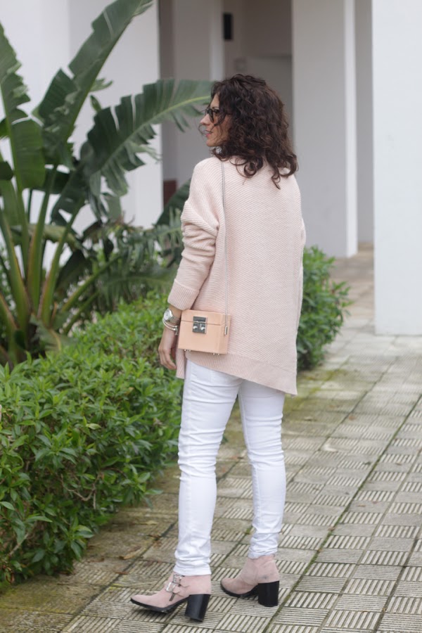 ¡Buenos días! ¿Qué tal habéis pasado el fin de semana lluvioso? Nosotros bien, fin de semana de sofá, mantita y pelis aunque aprovechamos que ayer dejó de llover para salir y hacer estas fotos. Tanto el jersey como el bolso los compré en las rebajas de invierno, me enamoraron el color empolvado que tienen. Además, el bolso es una monería, es de piel y rígido, tipo cajita con un espejito dentro ^_^. Para combinarlo opté por vaqueros y camisa blanca y botines rosa empolvado que ya habéis visto aquí, aquí y aquí.
