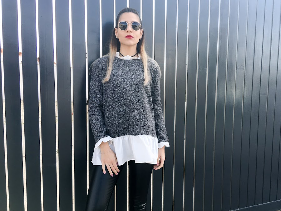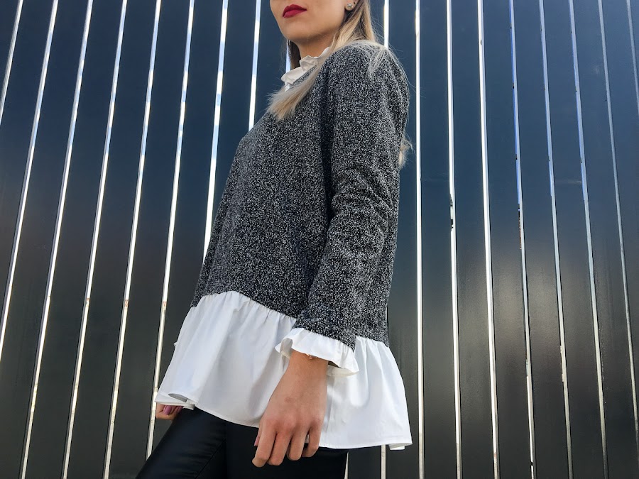 Esta vez el protagonista de hoy es mi jersey de un color gris oscuro jaspeado y efecto camisa con un volante en el cuello y las mangas! Es absolutamente precioso y que genial!!