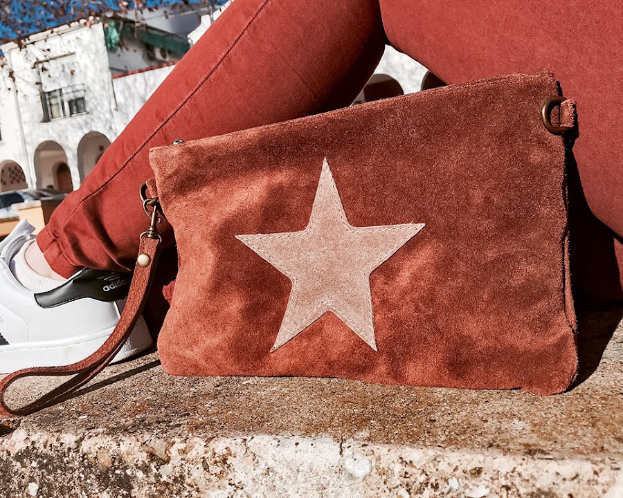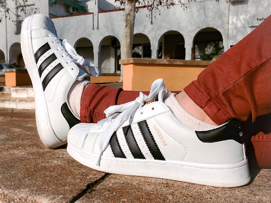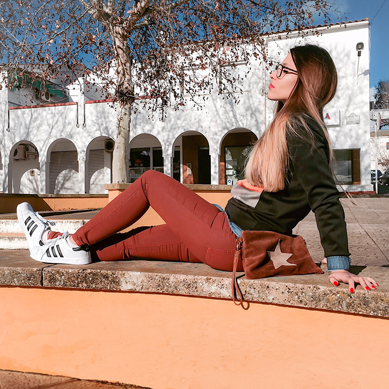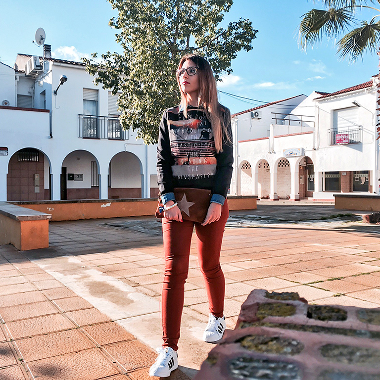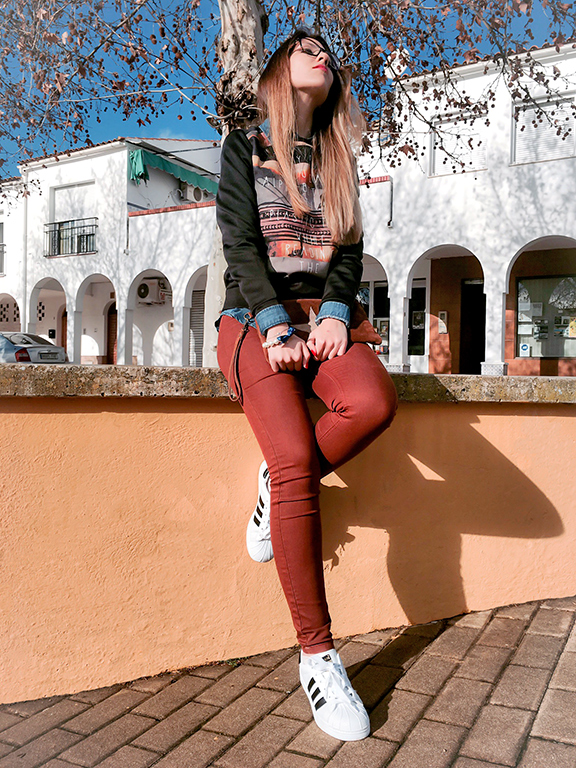 La he combinado con una camisa vaquera debajo de ella, mis jeans de color marrón y mis Adidas Superstar. Y para completar el look he usado un bolso clutch marrón con una "Superstar" en el centro.