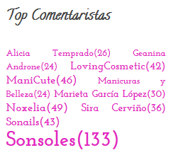 Las siguientes chicas tendrán 4 participaciones más, por ser top comentaristas (justo en el momento de publicación de esta entrada): Alicia Temprano, Geanina Androne, LovingCosmetic, Manicute, Manicuras y Belleza, Marieta García López, Noxelia, Sira Cerviña, Sonails y Sonsoles.