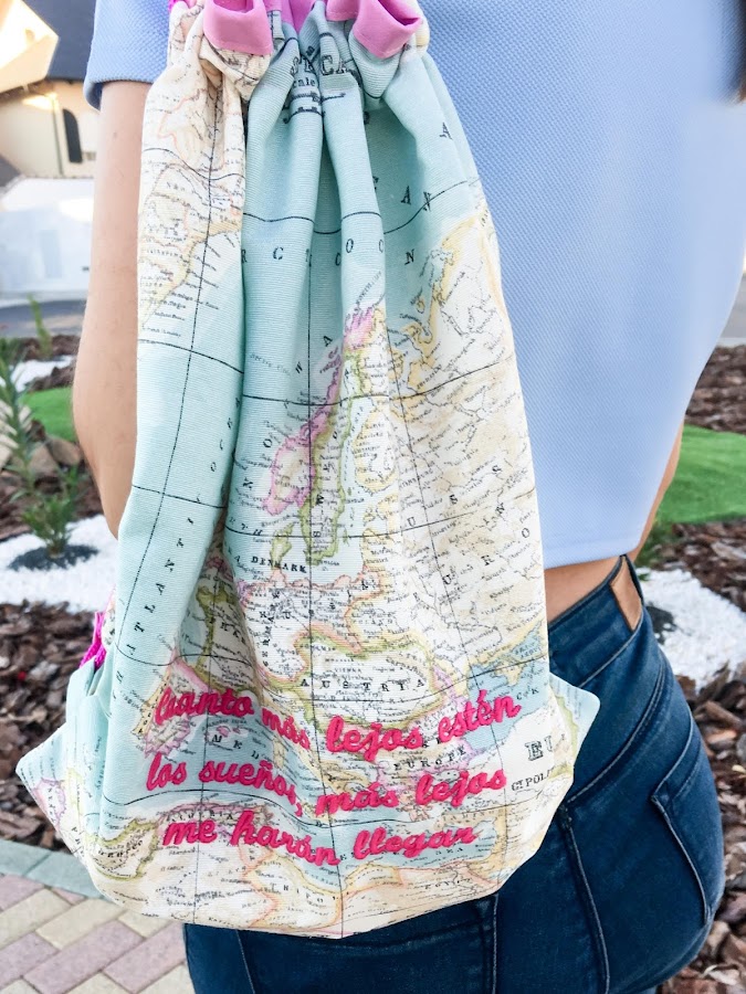 MARIAN & ME es una marca de bolsos y complementos hechos a mano con mucho cariño y 100% hecha en España, haciendo que nos sintamos únicas con cada pieza. Los materiales de sus bolsos son piel de vacuno, algodón, lonetas, entre otros tejidos, todos de máxima calidad. Además, puedes personalizar sus bolsos con frases, tu nombre, tus iniciales... lo que prefieres.Para el look de hoy, he elegido una mochila de loneta estampada con el mapamundi, con forro interior 100% algodón y cierre de cordón de color rosa. Además, puedes incluir una frase, la que más te guste y te motive, bordada a mano. Mi frase: "Cuanto más lejos estén los sueños, más lejos me harán llegar". Esta frase me encanta, ya que todos tenemos sueños, sueños que a veces parecen inalcanzables, pero con esfuerzo, paciencia y coraje, somos capaces de hacerlos realidad.
