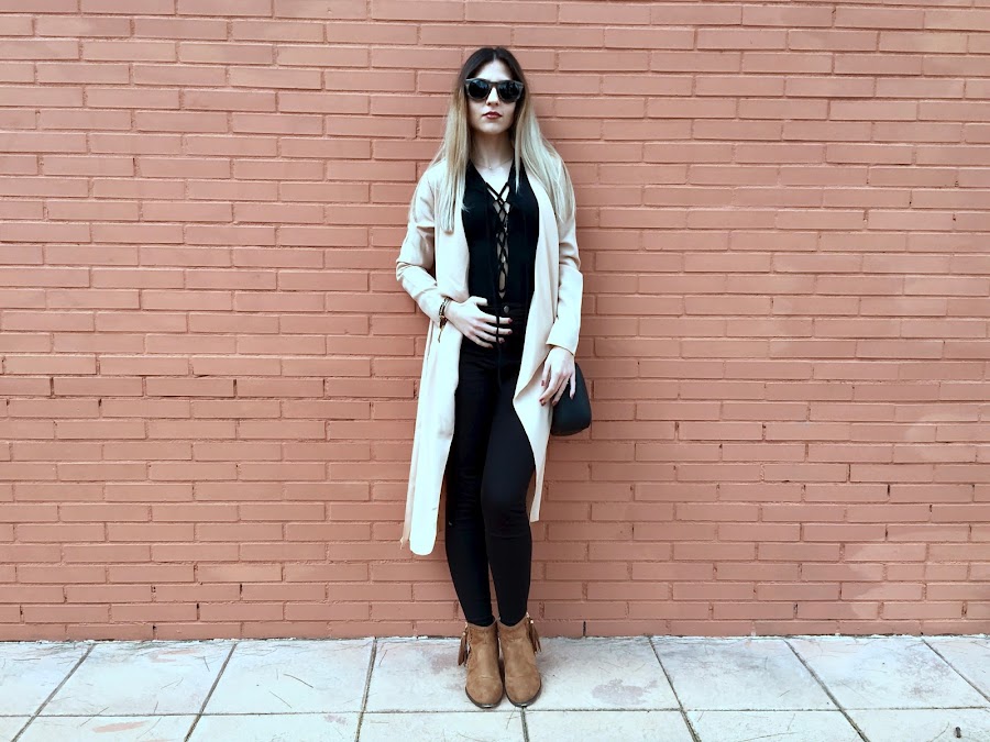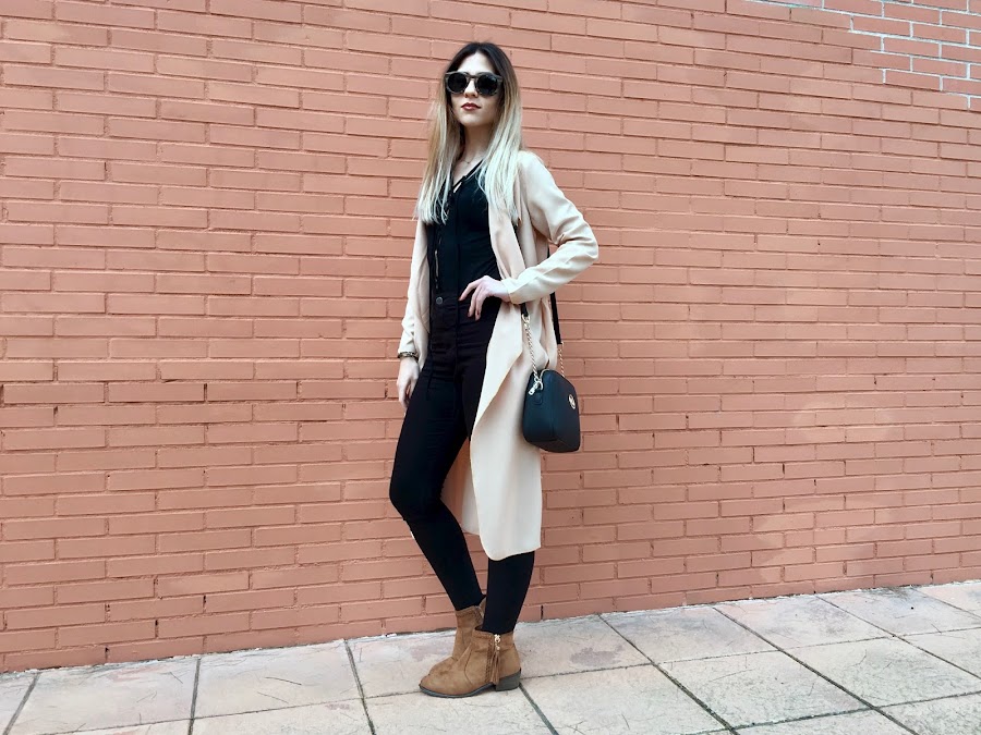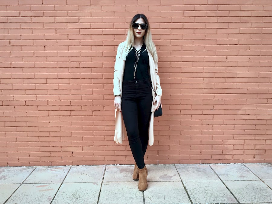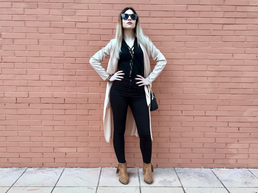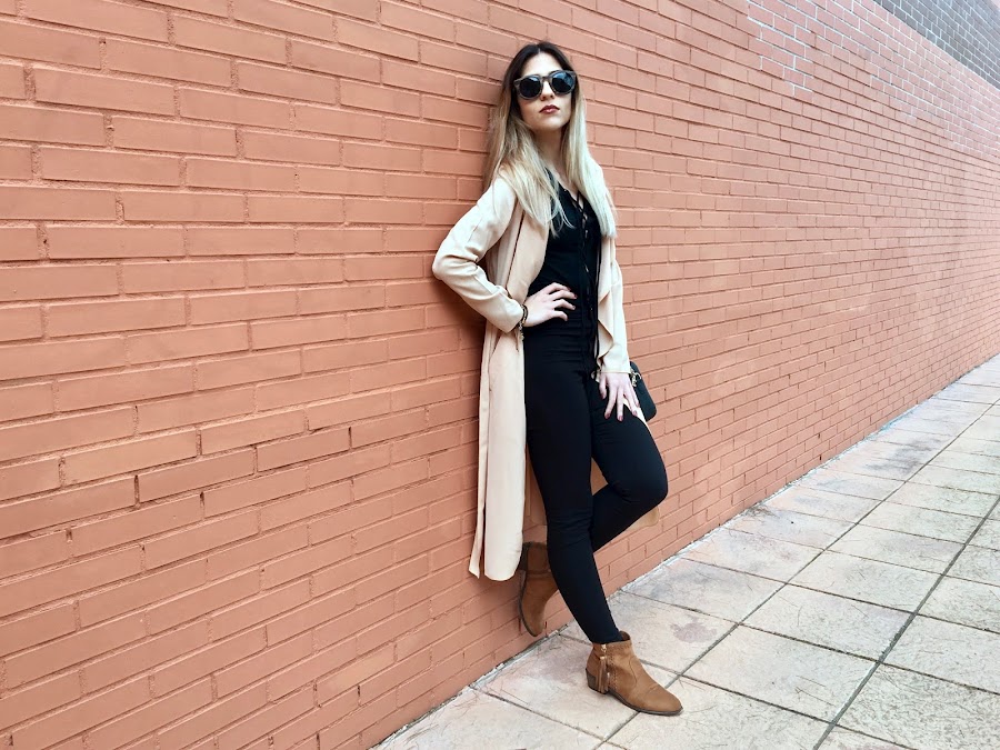 En cuanto al look, os traigo un total black, con un body negro de escote infinito de cordones de LOOKBOOK STORE (que también podéis conseguir en Amazon) y unos jeans negros, combinado con un trench color camel de SHEIN.