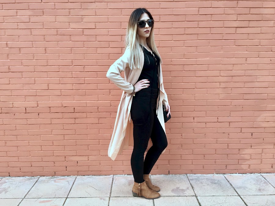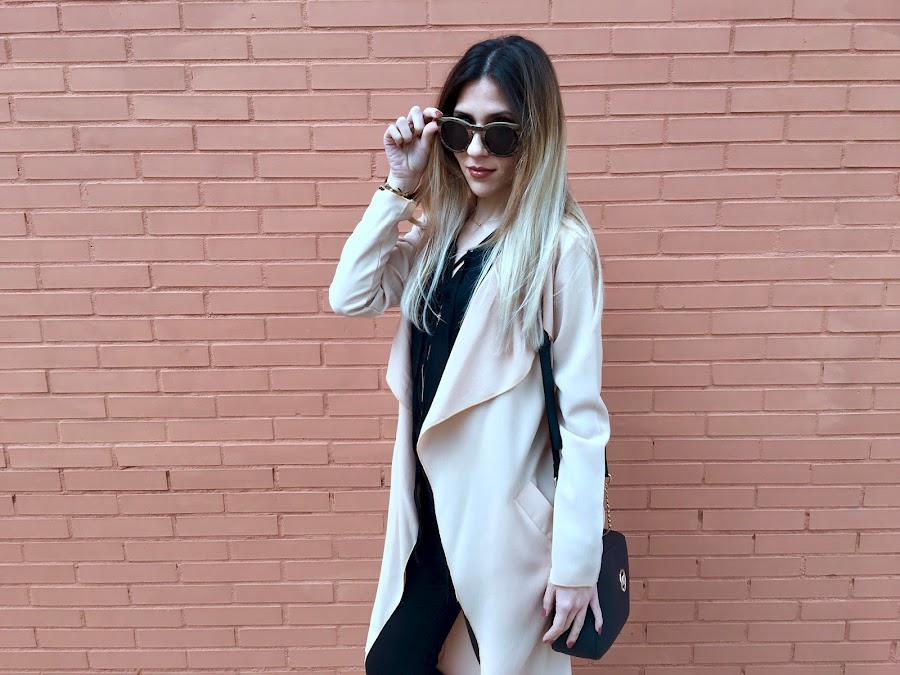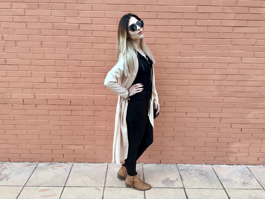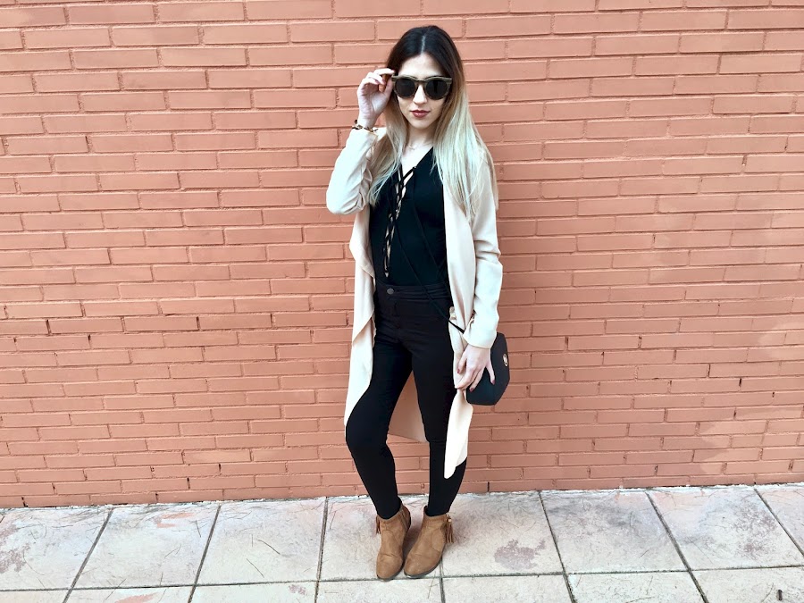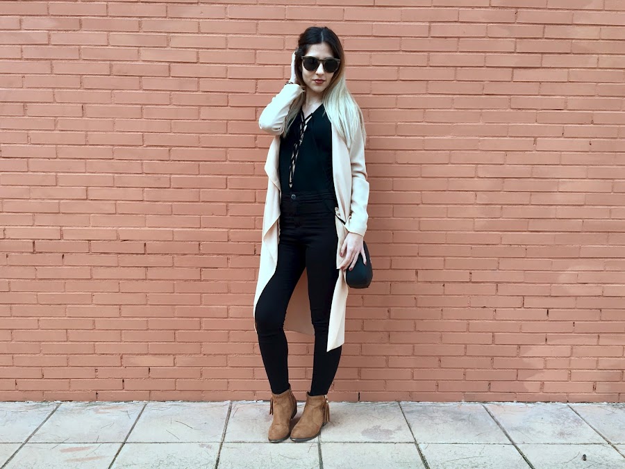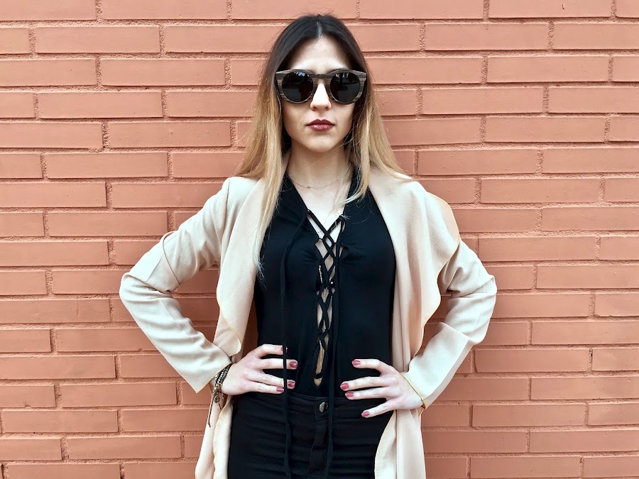 En cuanto al look, os traigo un total black, con un body negro de escote infinito de cordones de LOOKBOOK STORE (que también podéis conseguir en Amazon) y unos jeans negros, combinado con un trench color camel de SHEIN.