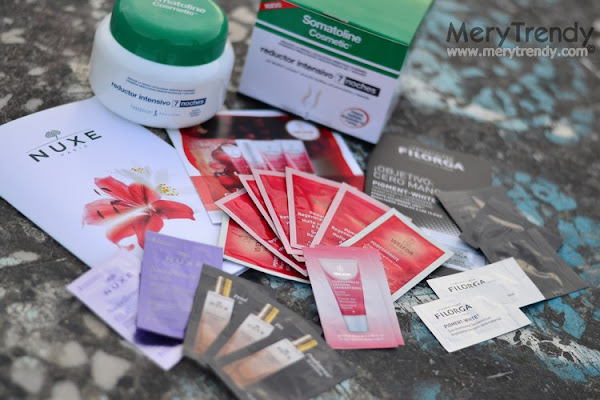 ¡Ah, sí! y ya, a modo de cotilleo, enseñaros mi última adquisición, porque como sabéis, cada vez recurro más a esto de las compras por Internet y como en farmacias 1000 la compra se efectúa al igual que en una tienda online de las que suelo visitar, la herramienta resulta bastante sencilla de utilizar (además, los productos está ordenados por familias) y la entrega se produce antes de 48 horas, así que me he dado un capricho y me he hecho con el tratamiento reductor ultra-intensivo de acción rápida y eficacia reductora potenciada, con primeros resultados demostrados en 7 noches (según reza la descripción del mismo), SOMATOLINE REDUCTOR INTENSIVO 7 NOCHES de JOHNSON & JOHNSON, que, según me han comentado es perfecto para mujeres con adiposidad localizada en caderas, muslos y cintura. Y, para mi sorpresa, la cajita en la que venía traía un montón de muestras de crema para la cara, el cuerpo, las manos... de perfume... Una pasada, vamos.