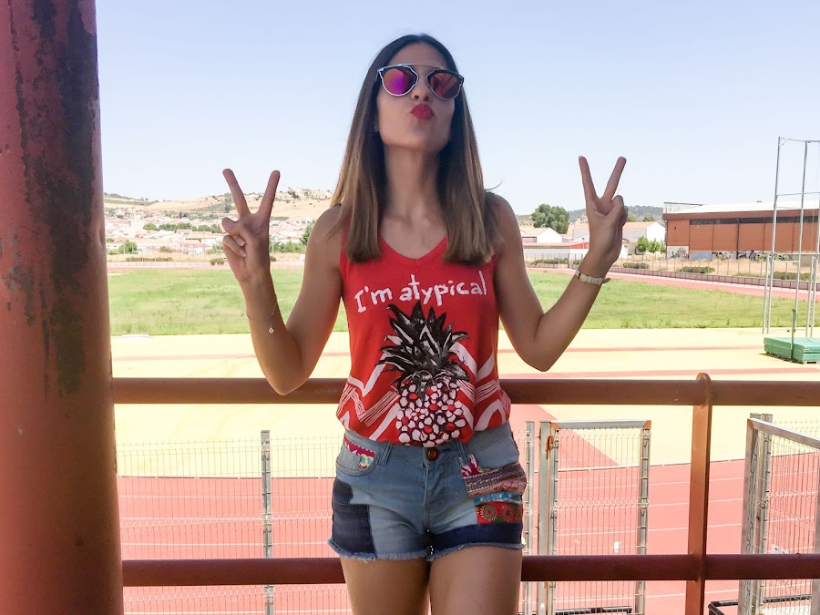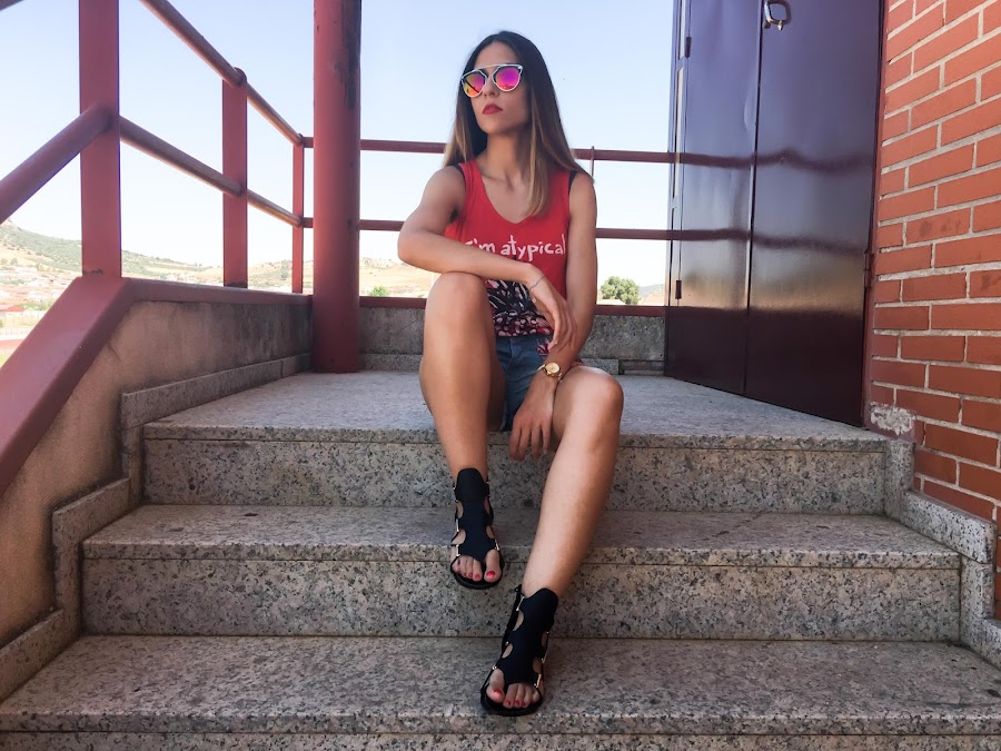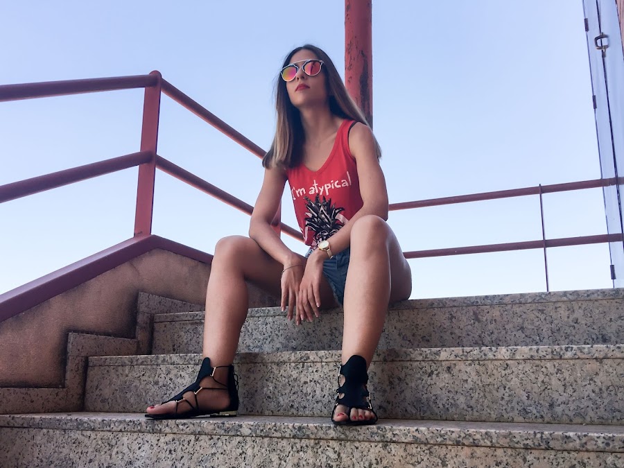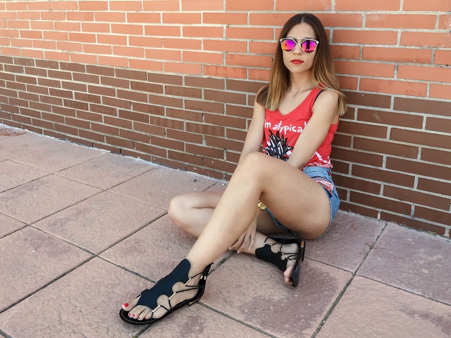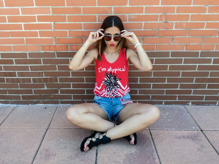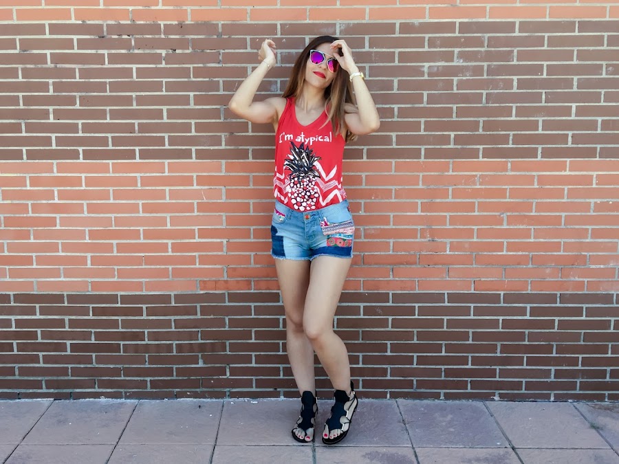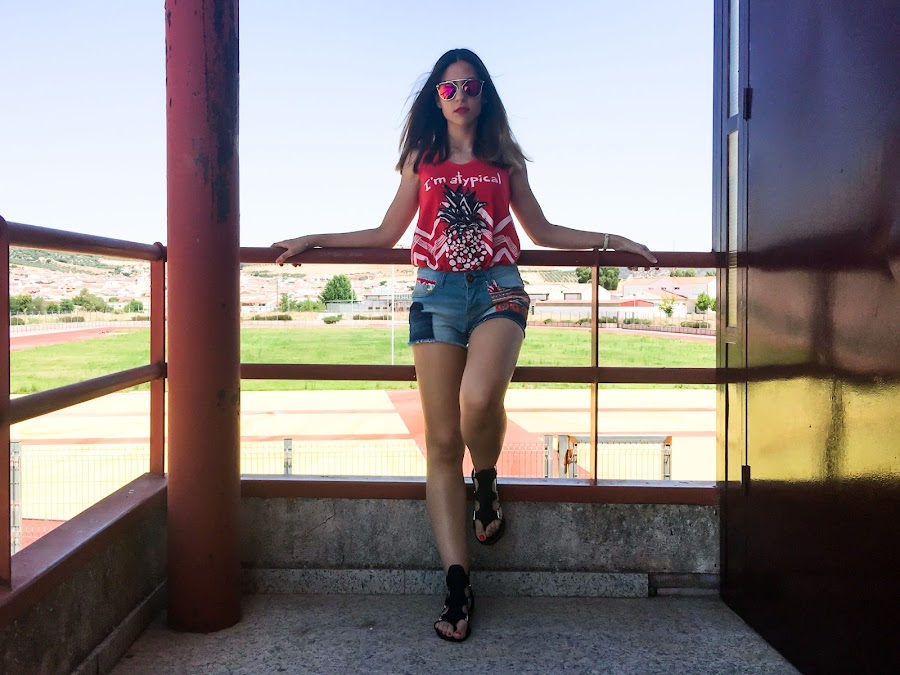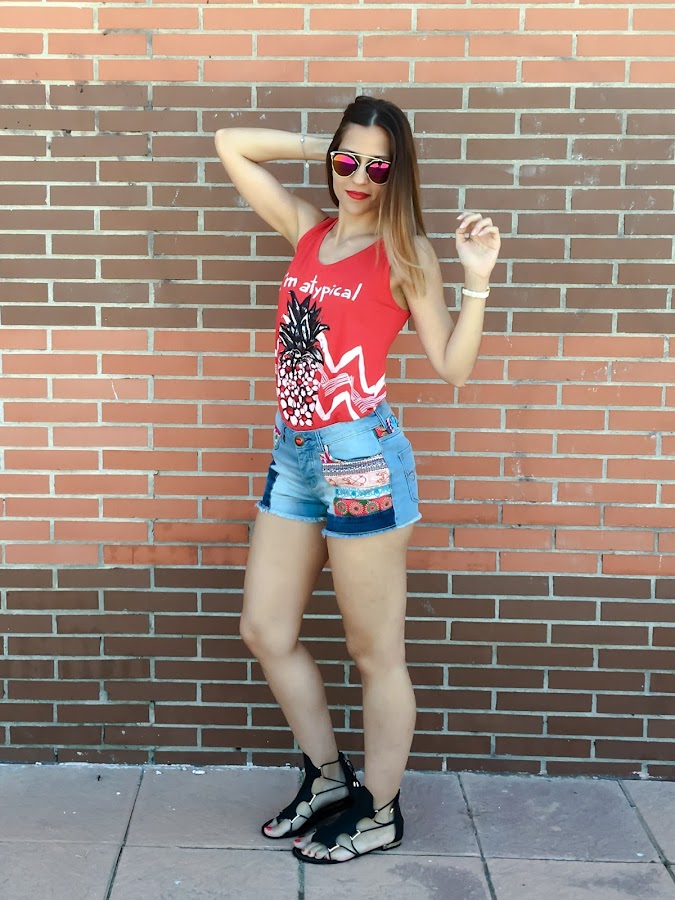 Este es uno de los looks más veraniegos. En verano no falta un short en mi armario! Pero no sólo es que no falte ni un short, es que tengo el armario repleto de shorts!! Jaja. Pero este es de lo más original, con estampado étnico en el lateral y en la parte trasera. Los he combinado con una camiseta roja con un estampado muy "atypical" con una piña estampada. Para mis pies he elegido unas sandalias negras también muy originales!!