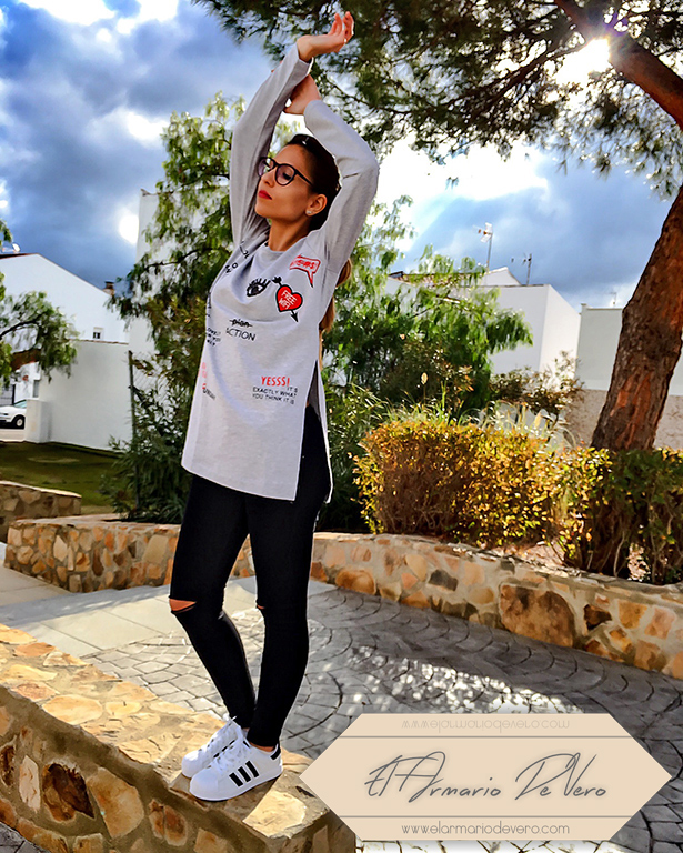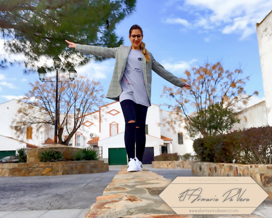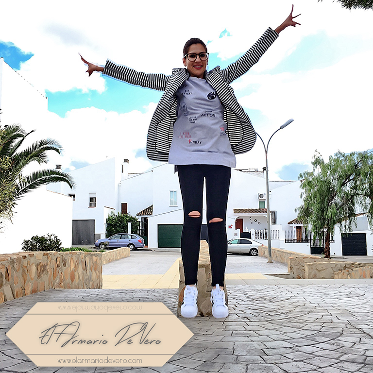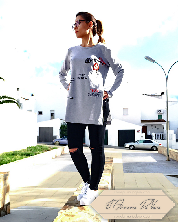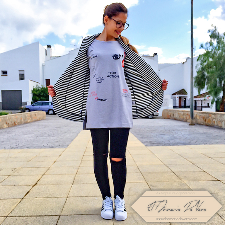 Por eso, para el look de hoy he elegido una maxi camiseta gris con laterales abiertos y unos parches que transmiten mucha positividad y energía y nos convierten nuestro día en un Funday!! La he combinado con mis queridísimos ripped jeans negros y una blazer de rayas en blanco y negro.