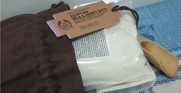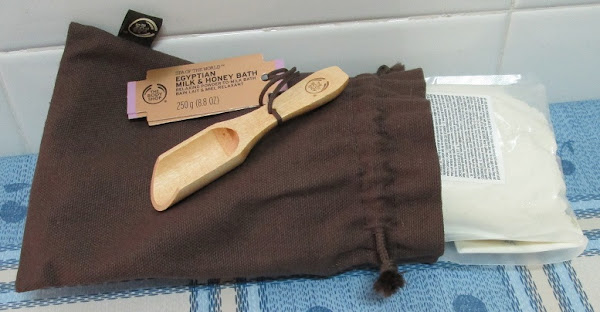 El primer producto que os enseño se trata de este "Baño de Leche y Miel de Egipto", el cual se presenta en una bolsa de tela, junto con una pequeña espátula de madera, de 250 gramos de cantidad.