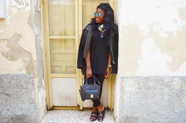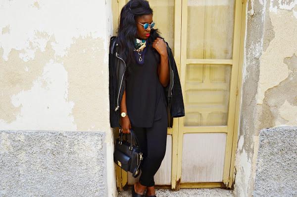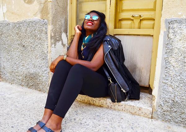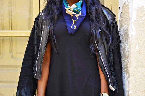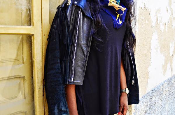 Chaqueta Flecos : Vintage / Camiseta abertura lados : Stradivarius (new) / Pantalones negros : Zara (old) / Ugly Shoes : Primark (old) / Pañuelo : Regalo / Bolso : Primark (old) / Reloj : Bisutería Online / Gafas : Zara (old)