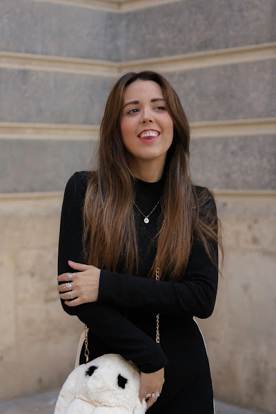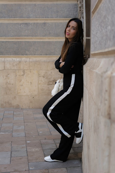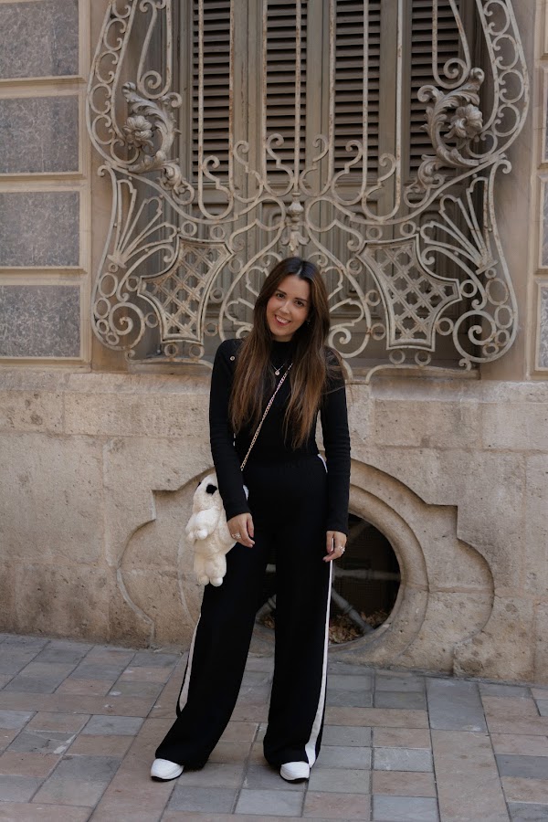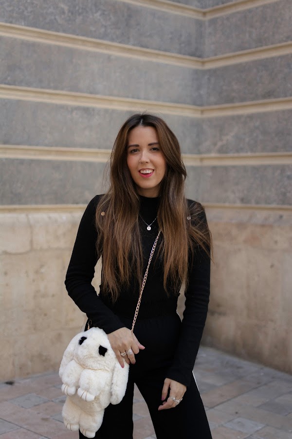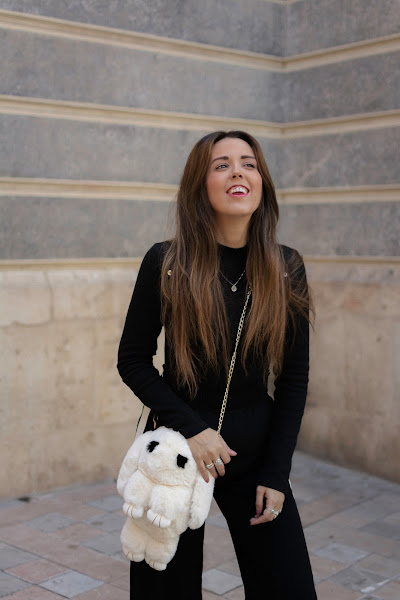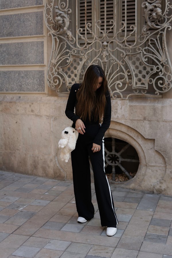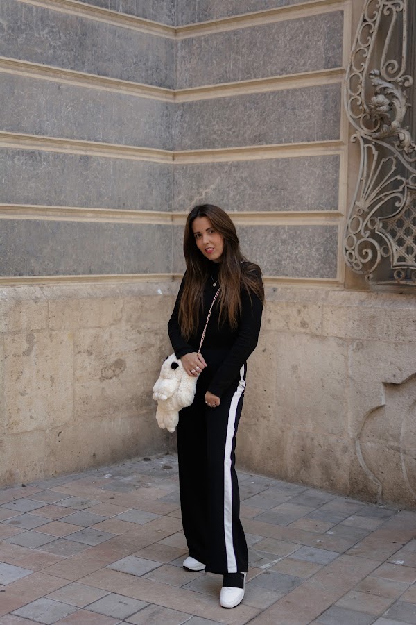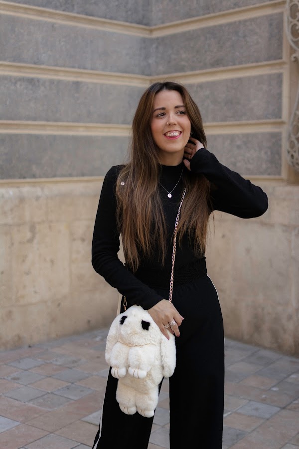 El color negro es el protagonista en camisa y pantalones, mezclándoselo con el blanco. He optado por un pantalón palazzo con toque deportivo y líneas en los lados en color blanco, lleva un elástico en la cintura por lo que aproveché para meter por dentro la camiseta. También el color negro, muy sencilla, de cuello tortuga y con botones en color dorado en la parte de los hombros. El bolsito como os decía arriba, es uno de los puntos fuertes del look. Original aunque un poco atrevido, no sé si os gustará tanto como a mi, pero me parece súper especial. Siempre me gusta llevar peluchitos y cositas colgadas de algunos bolsos, incluso tengo un conejito igual que este que a veces llevo en mi bolso colgado. Cuando vi este en formato bolso, me pareció tan ideal que tuve que comprármelo. Además es tan suave, que dan ganas de estar acariciándolo todo el rato.