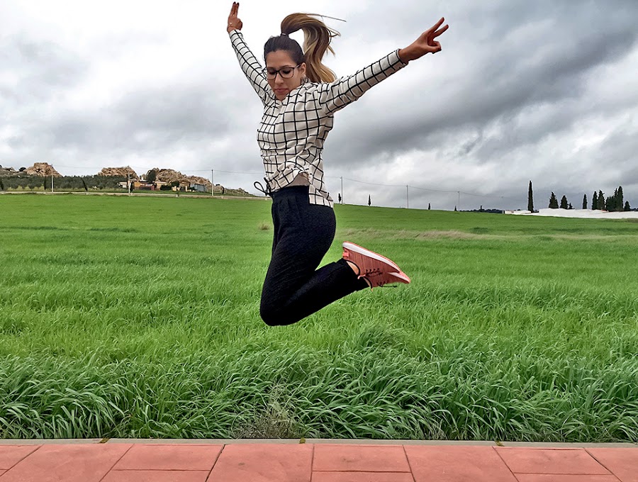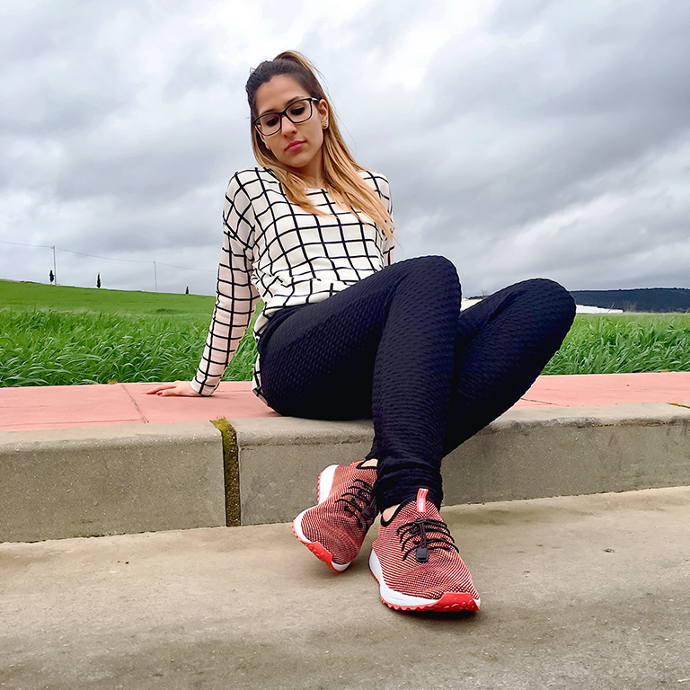 Lo he combinado con una camiseta de cuadros en blanco y negro y le he dado color al look con unas zapatillas súper coloridas con colores neón!