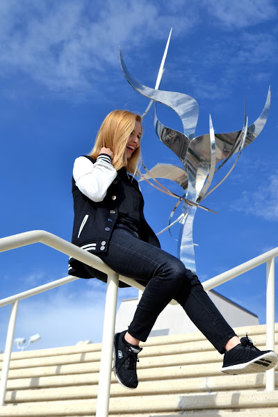 4.- Si no eres muy arriesgada usa aquellos zapatos deportivos en colores clásicos, todos negros o todos blancos y de seguro no fallarás. Así hice yo con este outfit que les traigo hoy, un total black look nunca falla con unos zapatos deportivos en negro y una chaqueta varsity que le da un toque juvenil y fresco al look.