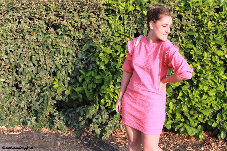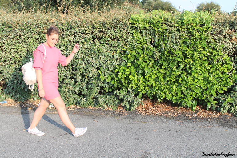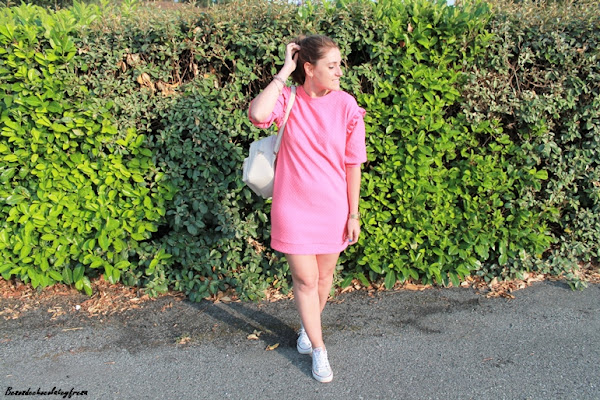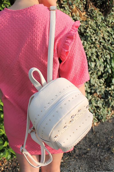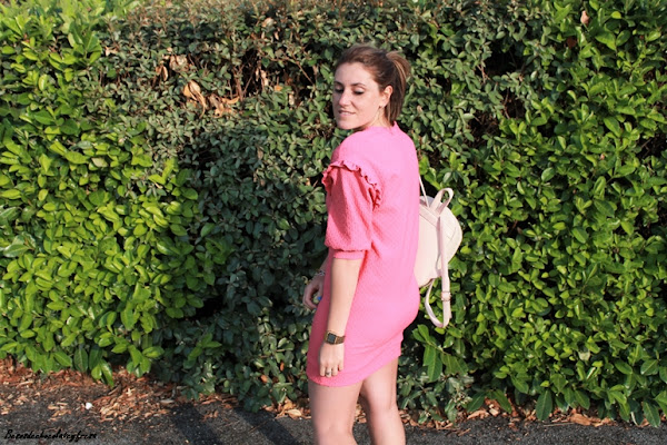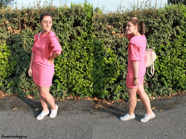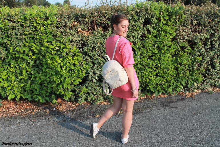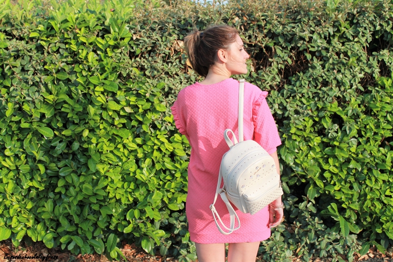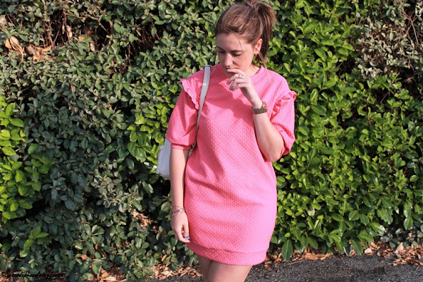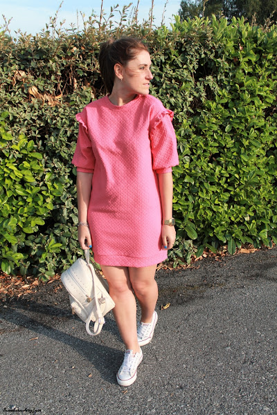 Por ese camino va el vestido que os enseño hoy, un vestido en clave sport pues simula una sudadera pero con toques chic como es el color, el relieve del tejido haciendo dibujos y sus volantes en los hombros. Perfecto para llevera con nuestras sneakers preferidas y patear la ciudad. Si a este look le añadimos una mochila creamos el look sport por excelencia.
