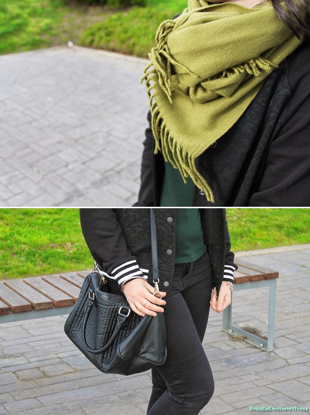 Today I show you an outfit consisting of black and military green tones. This led baseball in black jeans and a T-shirt and sneakers in military green. As supplements I chose tote bag in black and green scarf-blanket. A very sporty look