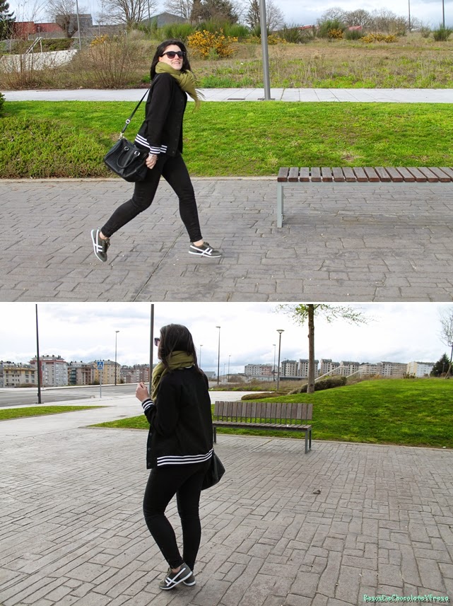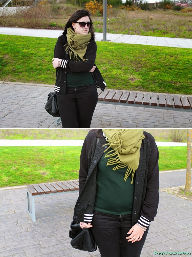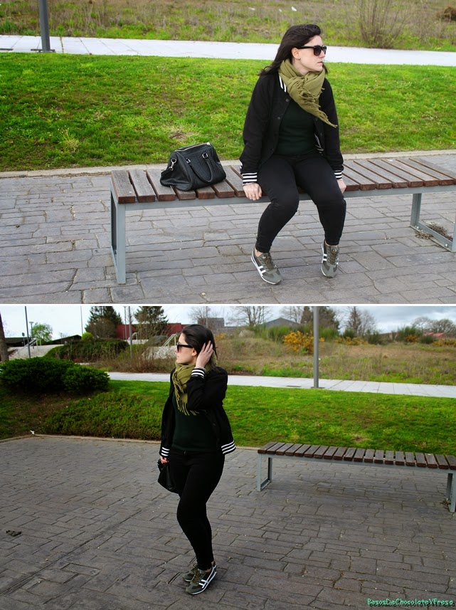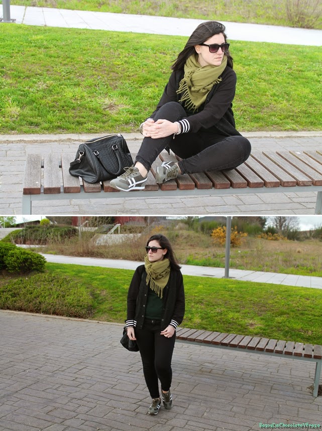 Hoy os enseño un outfit compuesto por tonos negros y verde militar. Para ello llevo jeans y beisbolera en negro con camiseta y sneakers en verde militar. Como complementos opté por bolso tote en negro y bufanda-manta en verde. Un look muy deportivo