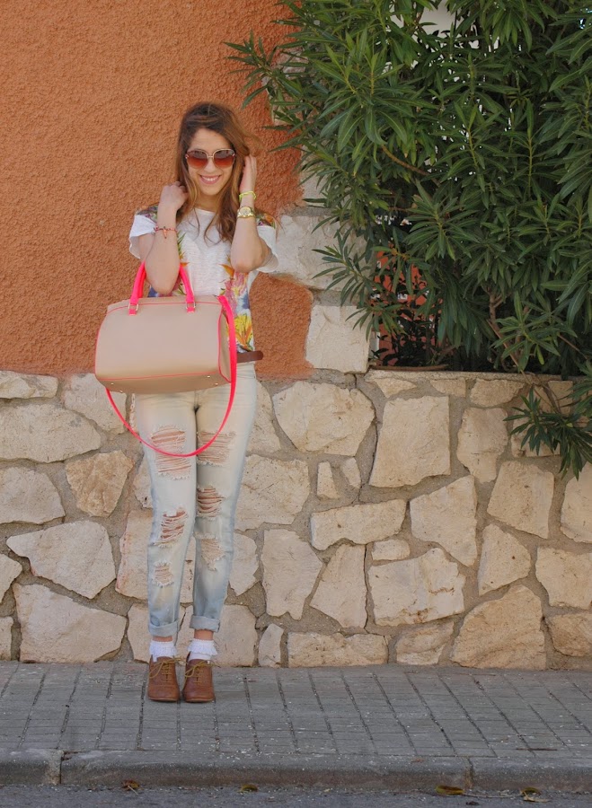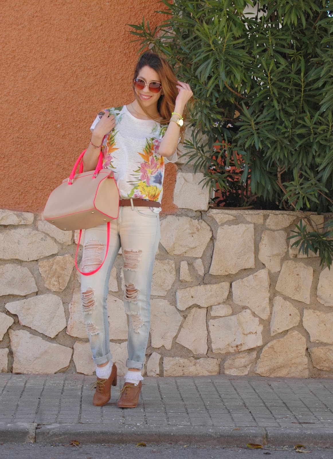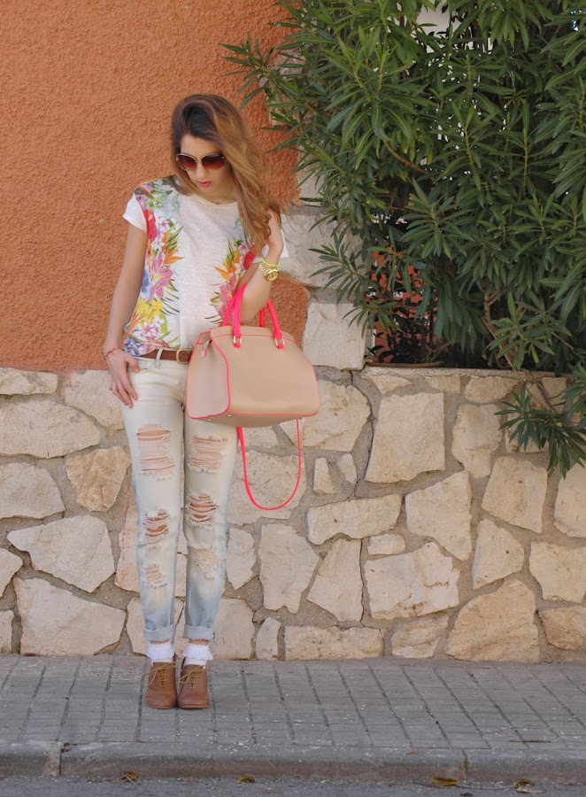 Siii la primavera está llegando..!! Hace unos cuantos días que ya nos deja unos pequeeeeños rayitos de sol y a mi, sinceramente, me dan la vida!! Pero por otro lado, teniendo que estudiar, preferiría que lloviera a cántaros porque mantener el culete pegado en la silla de estudio con este tiempo en la calle puede ser misión imposible..¿verdad? En este post me he olvidado de abrigos y chaquetas, de scarfs y pañuelos al cuello para dar paso al estampado floral, a los jeans rotos (gran tendencia esta temporada), al color, etc.. y de esta manera ir dando la bienvenida a la primavera como se merece ya que para mí es una de las estaciones más bonitas del año y la razón es la ropa taaan bonita que llega a las tiendas y tenemos oportunidad de lucir sin abrigos que oculten nuestros looks.