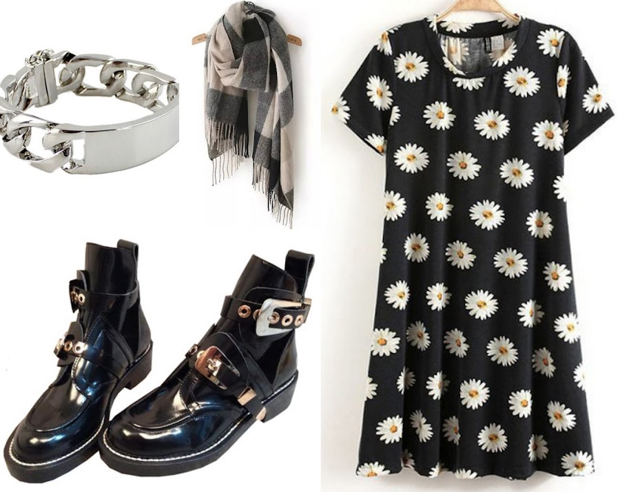 *The second outfit is full of daisies. I chose cut-out booties and to finish it, I added a silver bracelet and a grey and white scarf.