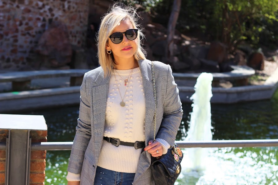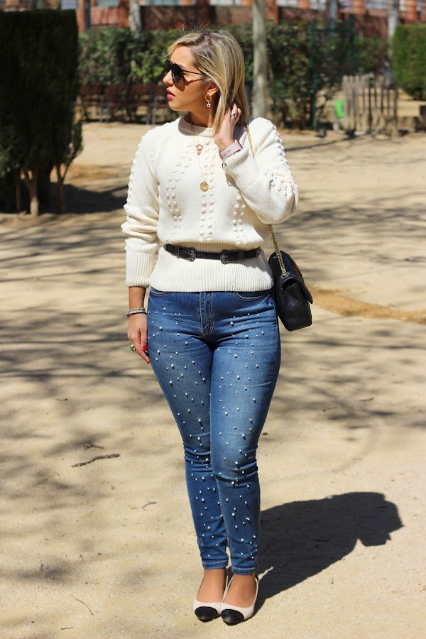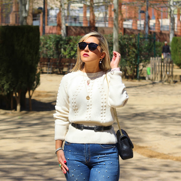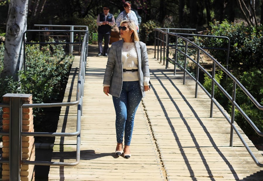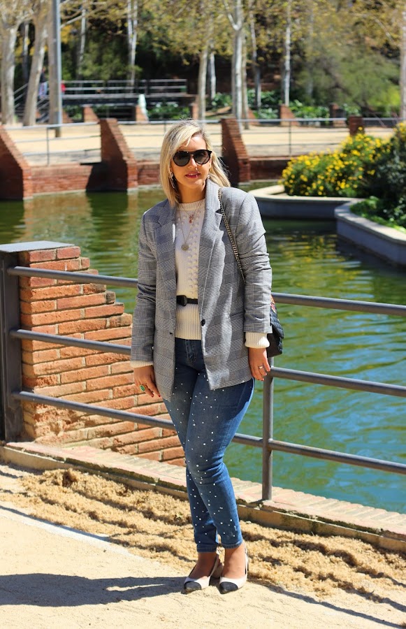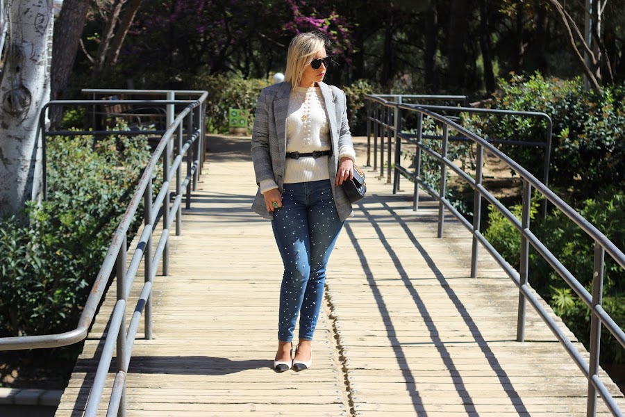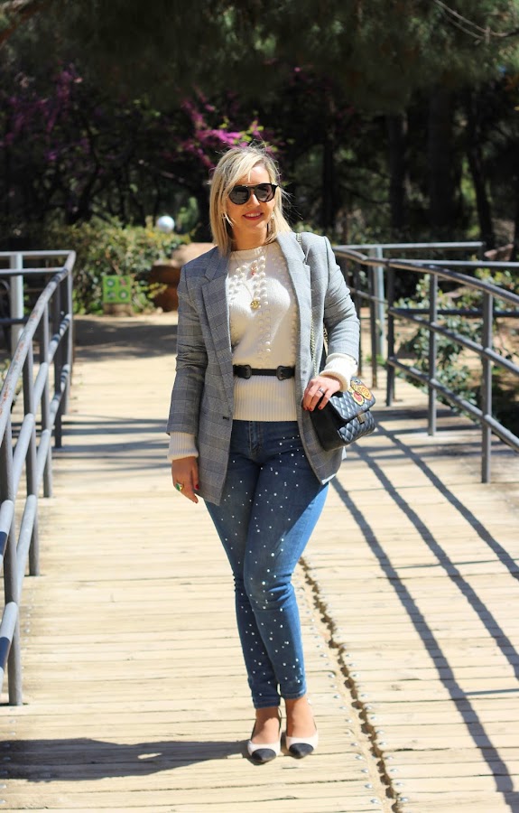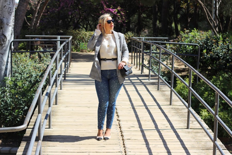 Y hoy os traigo un look casual chic, que son el tipo de looks que más me gustan para el fin de semana. En el look de hoy llevo mi nuevo jersey de Lovely Pepa Collection que me encantó en cuanto lo vi. Lo he combinado con mis jeans perlas y una blazer de cuadros, que siguen siendo súper tendencia esta primavera. Los accesorios que escogí fueron unos zapatos bicolor estilo Chanel y mi bolso negro con parches.