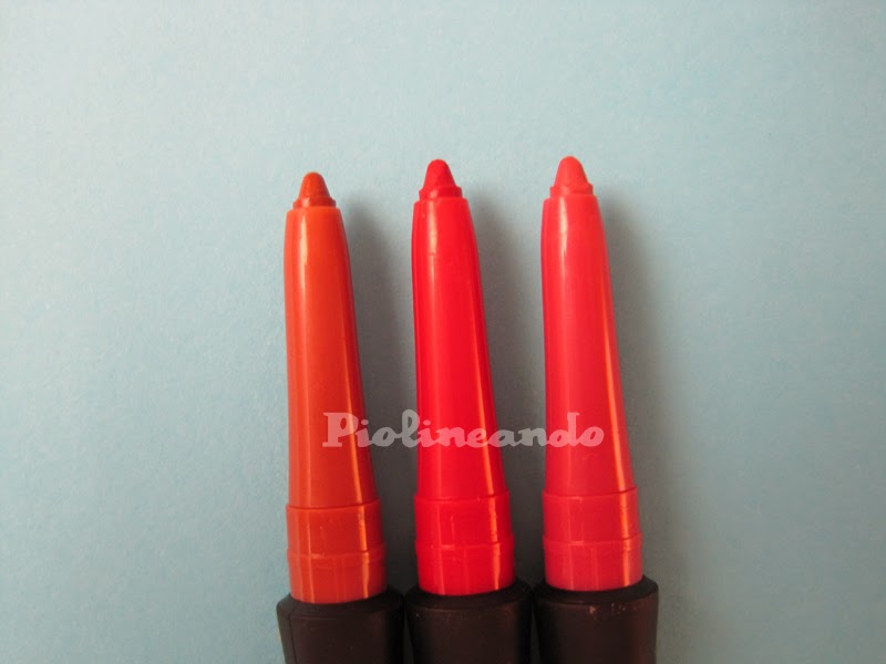 Empezamos con los perfiladores de labios, en tres colores, para todos los gustos: el clásico rojo, un rosita y un tono marrón. Son muy cremosos por lo que pigmentan genial con una sola pasada. Con ellos podemos tanto perfilar nuestros labios como rellenarlos por completo y poner encima el labial que queramos y así conseguir que nos dure mucho mas tiempo intacto en nuestros labios.