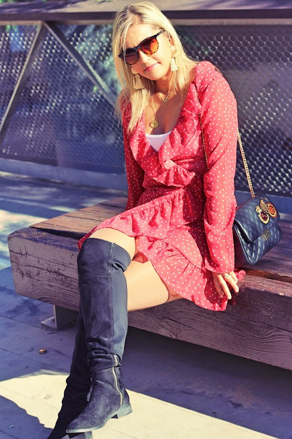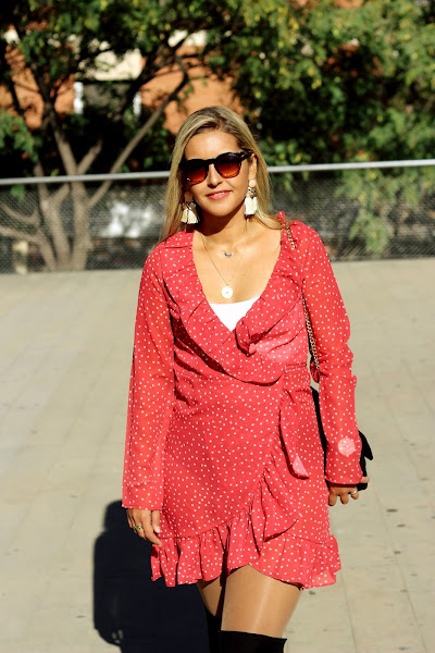 Hoy os traigo un look muy femenino. En el look de hoy os enseño mi nuevo vestido rojo con volantes y con estampado de estrellas de Zaful que me encantó desde el primer momento en que lo vi en su web. Lo combiné con mi biker negra, mis botas negras por encima de la rodilla y mi bolsito acolchado con parches. Como accesorios, le añadí mis nuevos maxi pendientes de color beige con flecos y mis nuevos colgantes.