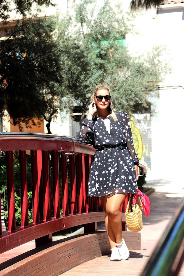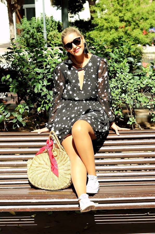 Hoy os enseño un look que me encanta para esta época de año. Llevo un vestido negro con estrellas que combiné con mis Converse y mi inseparable bolso redondo de rafia. Un look casual chic que me parece perfecto para llevar durante el fin de semana.
