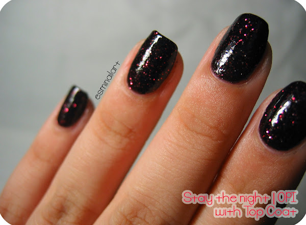 Yo os hice las fotos sin top coat y con él para que podáis ver la diferencia. Es increíble lo bonito que se ve el brillo del glitter rojo incluso con el acabado mate del propio esmalte. El top coat que le puse fue el Poshé, como siempre.
