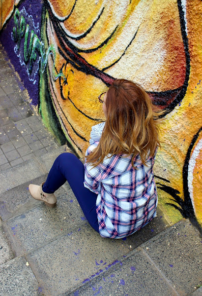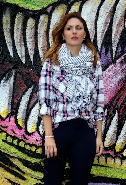 La bufanda es de rayas marineras que contrasta y resalta del estampado de cuadros azúl y rosa de la camisa, sé que no es una mezcla que guste mucho pero ya saben que me encantan los mix imposibles, creo que levantan el look porque sino pareceríamos que vamos todas de series encuadernadas.