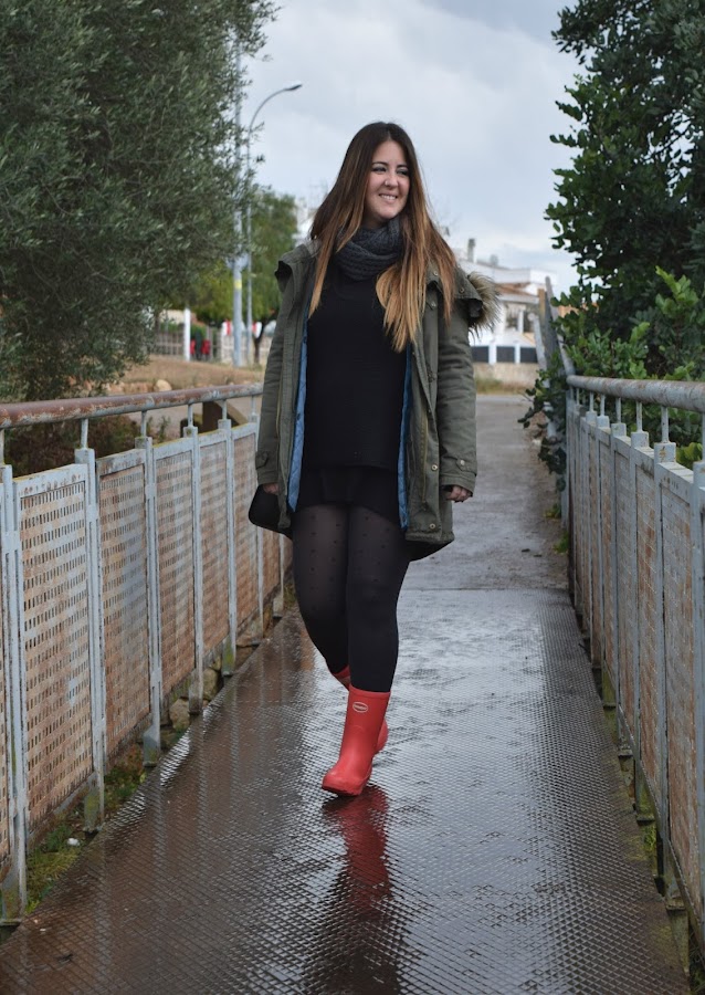 Good morning!! Yesterday we woke up to a rainy, gray and cloudy day, but curiously it came shortly a sunny day like spring. He we use water boots infrequently and always we can, we wear them hahaha. I combined them with total black look and green coat to give all the protagonism to the boots because they have a precious red. I hope you like it any enjoy this monday!!