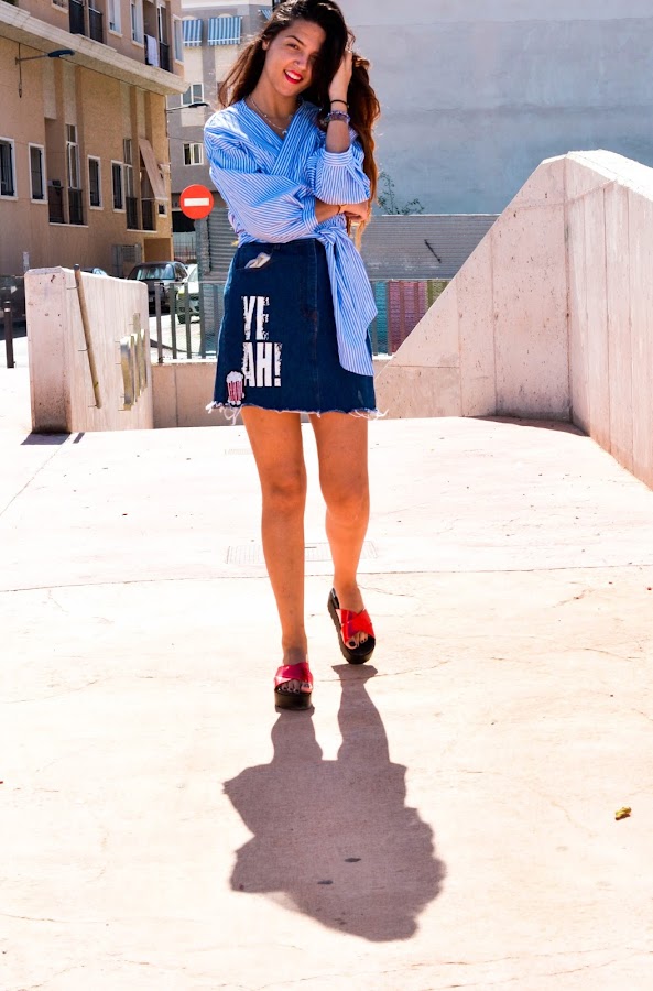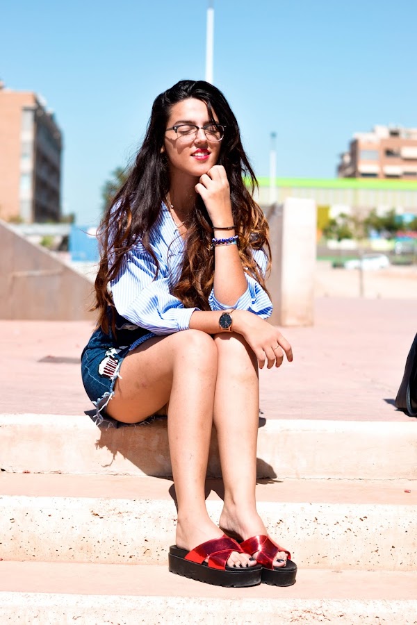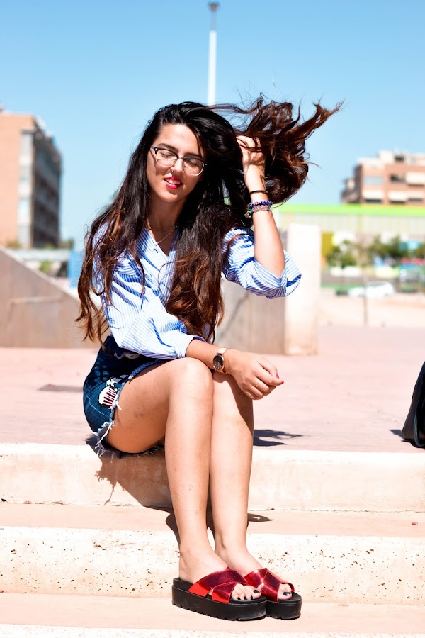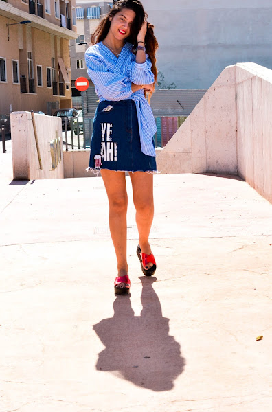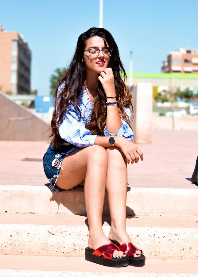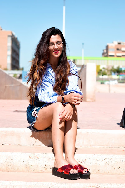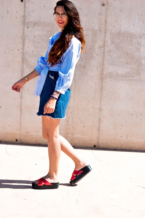 La combinación ha sido simple, así son los looks veraniegos, simples y repletos de color -necesito que llegue el invierno ya- he optado por esta blusa sin botones con estampado de rayas verticales y dolorsitos como diría Ratonlina. No sabéis el daño que me hacen estas plataformas y lo mucho que me gustan. Por favor, si alguna tiene una especie de truco para que dejen de hacerme esas tremendas llagas en los pies os prometo que os querré eternamente. ¡Ya no se que hacer!. Mis pies en verano acaban hechos un Picasso.