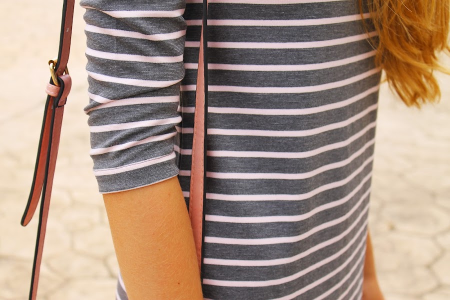 Hoy la cosa va de rayas. En el look de hoy predominan básicamente tres colores gris, rosa palo y el blanco. Este outfit es ideal para ir a clase, ir a pasear o cualquier cosa. Este vestido me ha encantado creo que debería ser un must de otoño. Es de la marca Vila y tiene un precio genial.