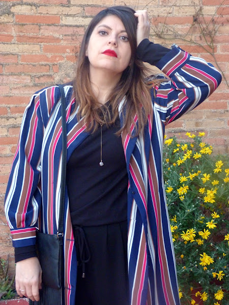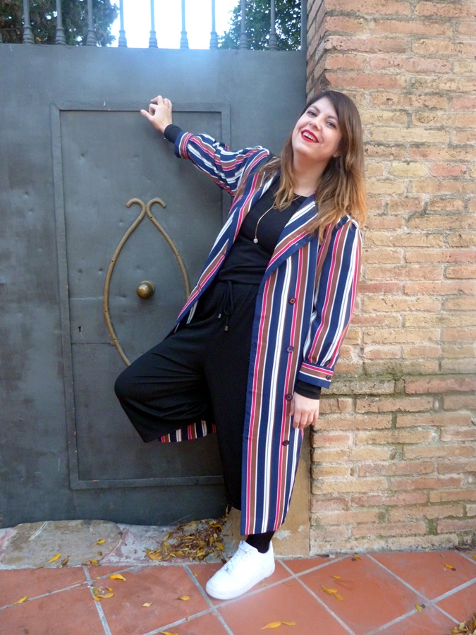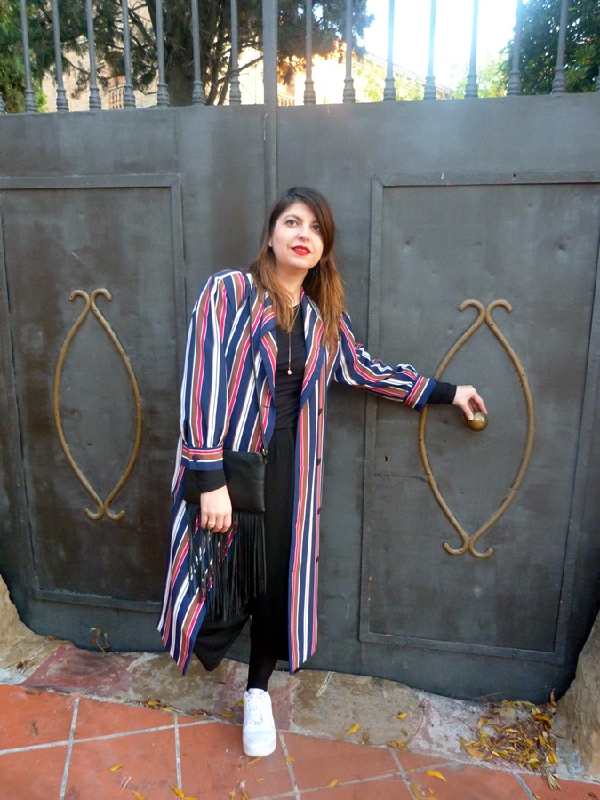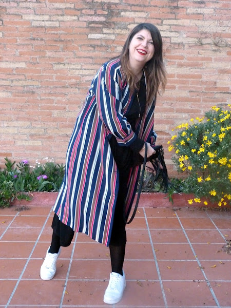 Ésta prenda de rayas que os enseño hoy cuando la ví en la tienda me enamoró por completo, su estampado a rayas, que me chiflan, su colorido diferente, textura y el patrón noventero me encantó, sólo había un problema era un vestido con adorno de botones delanteros pero cosido, le propuse a la dueña de la tienda si podía descoserlo para lucirlo como camisa larga o trench y muy amablemente lo hizo, así seguro que le saco mucho más partido, ¿no creéis?