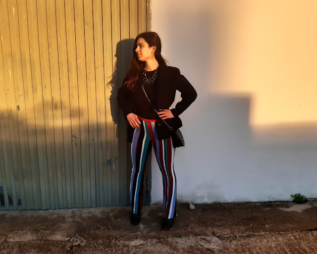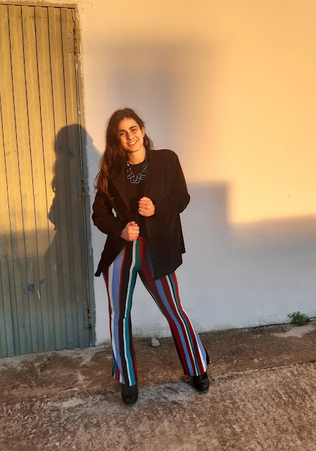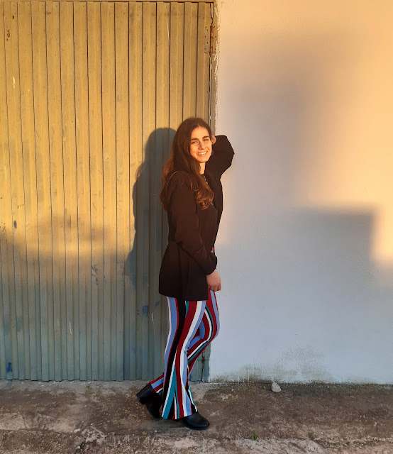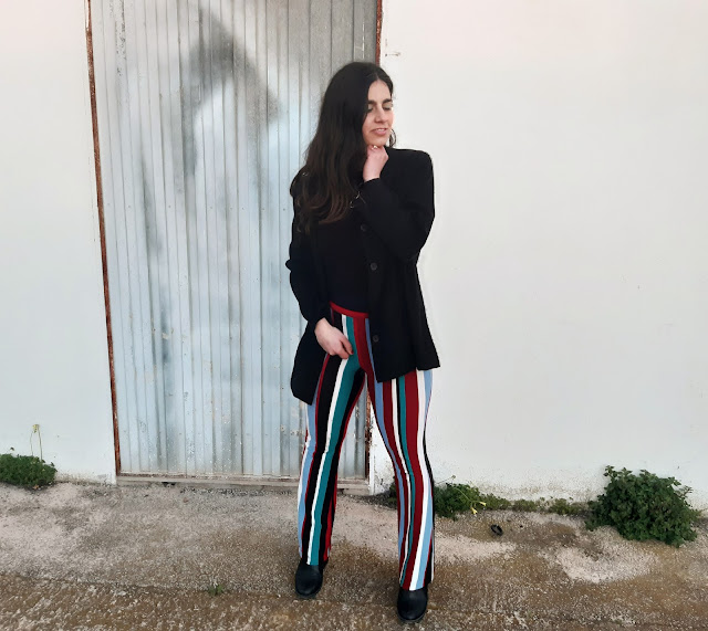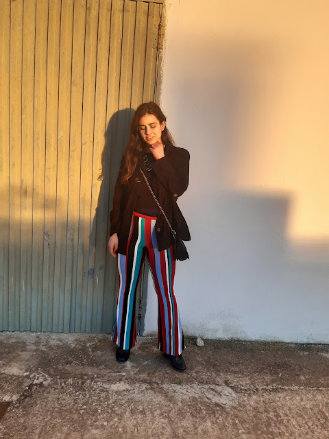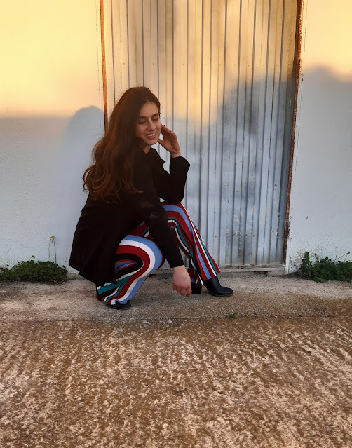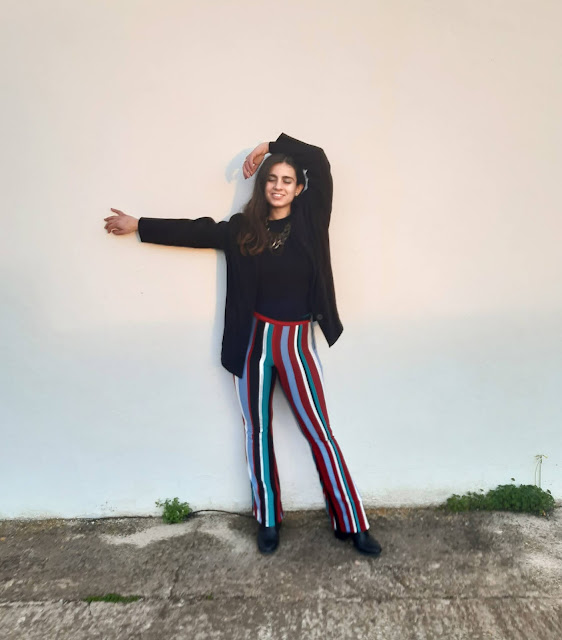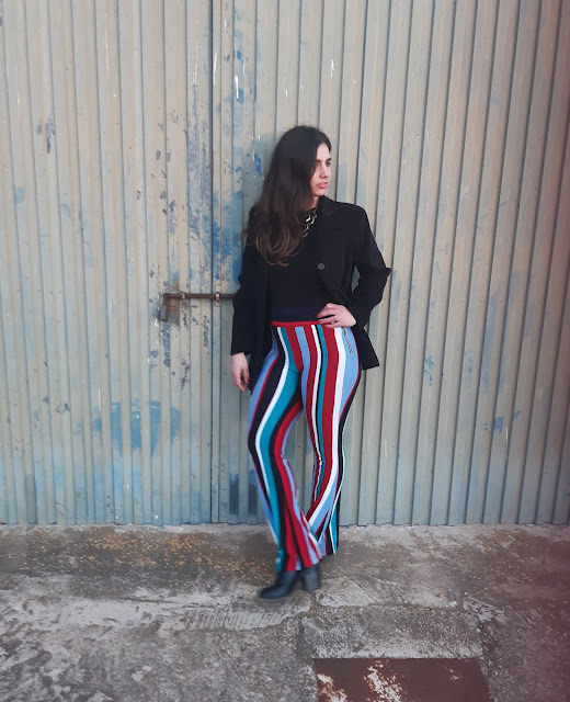 Buenos días y feliz semana. Estoy muy contenta de volver a estar por aquí, daros las gracias por vuestras visitas. Hoy vengo con un nuevo look para este domingo de San Valentín. Este conjunto es bastante diferente al que os enseñé la semana pasada (os lo dejo aquí), son unos pantalones de pata elefante de rayas y un top negro. Últimamente, me estoy vistiendo con prendas negras; ¿a vosotras también os pasa? Los pantalones fueron un regalo de una amiga y me parecen una opción elegante, estilosa y perfecta para lucir en estas fechas.