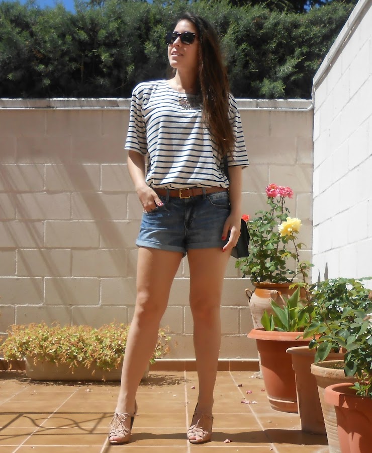 He creado un look sencillo y fresquito para estos días, ahora que empieza a hacer calor, combinando la camiseta y el cinturón con shorts vaqueros, sandalias nude, un collar en gris y bolso negro.