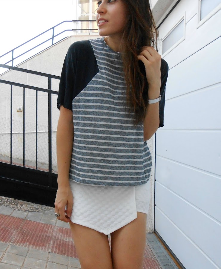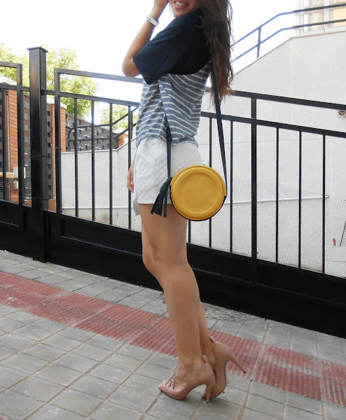 Today"s outfit is composed of my two favourite items: my white skort and a basic stripe t-shirt. Both are essential for summer. I completed the outfit with nude sandals and the yellow bag that I showed you on the last outfit. Do you like the result?