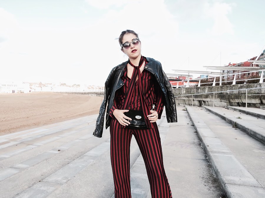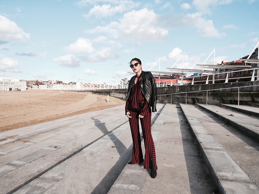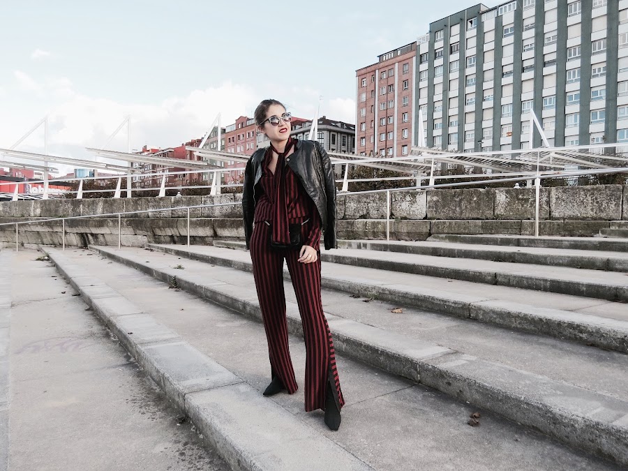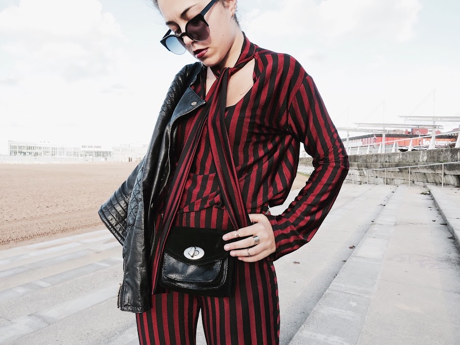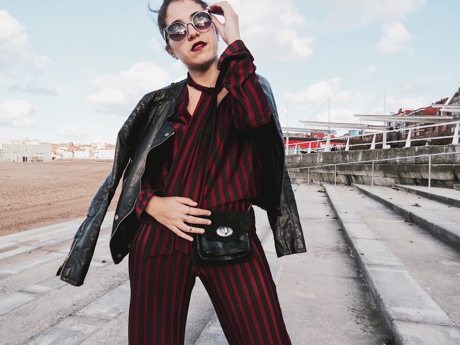 Llevo un total look de rayas en tono burdeos y negro, combinado con mis botines-calcetínes favoritos de la temporada, biker negra y mi nuevo bolso estilo riñonera. ¿Os gusta?.