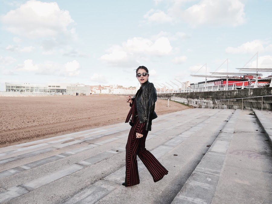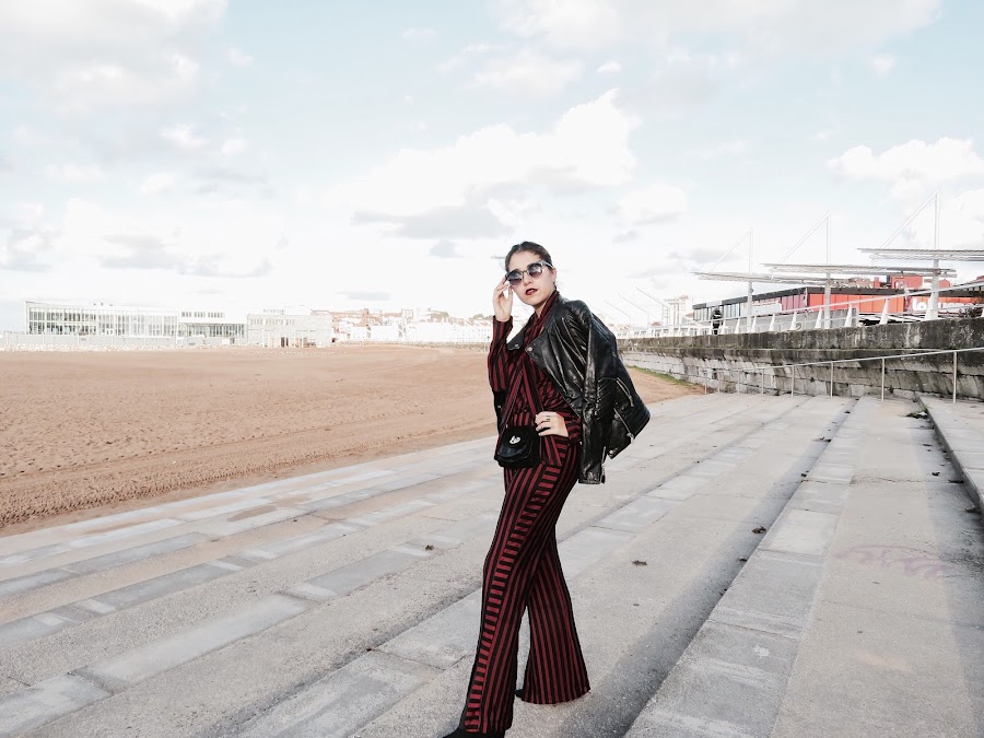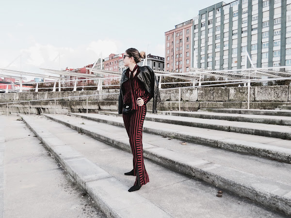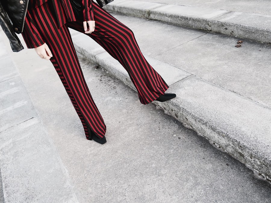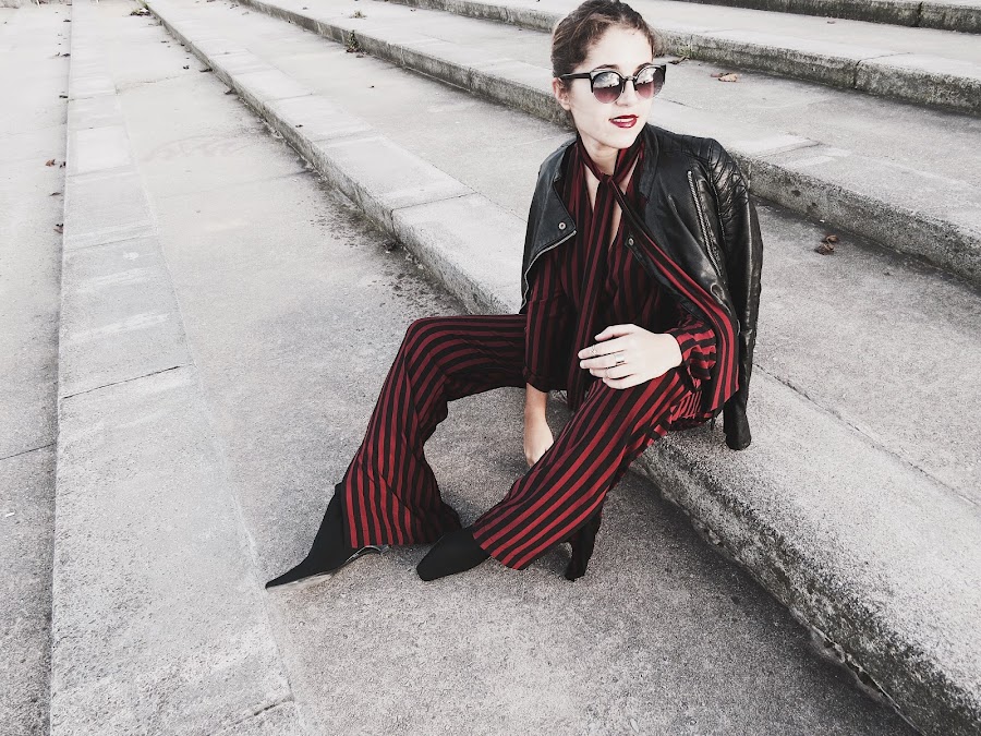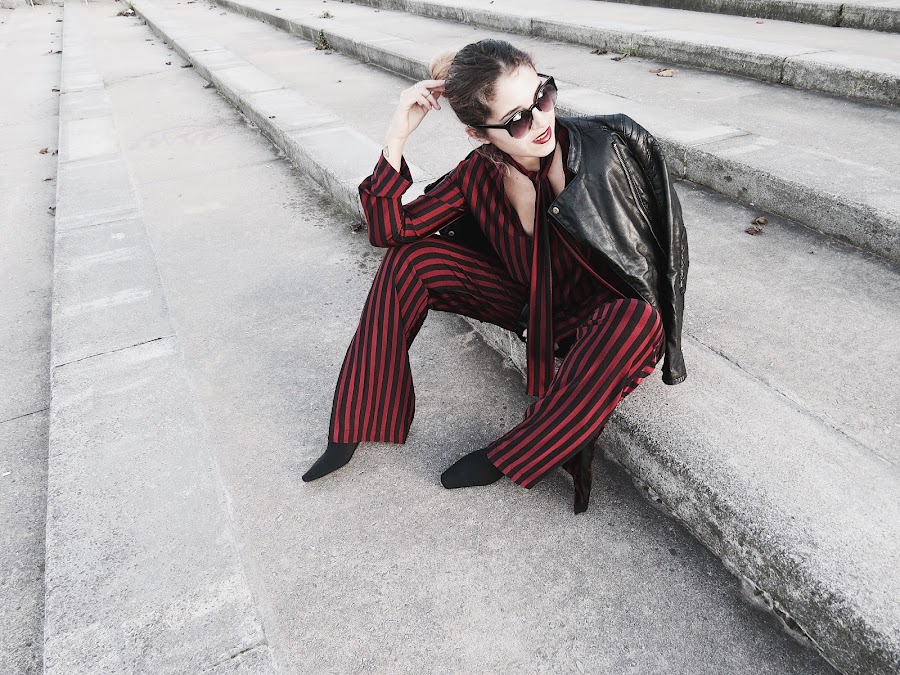 Llevo un total look de rayas en tono burdeos y negro, combinado con mis botines-calcetínes favoritos de la temporada, biker negra y mi nuevo bolso estilo riñonera. ¿Os gusta?.