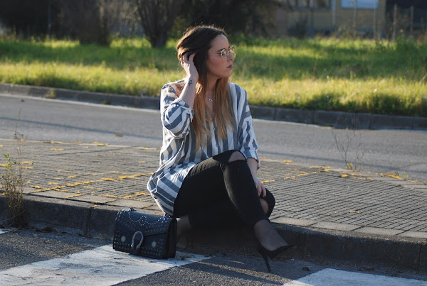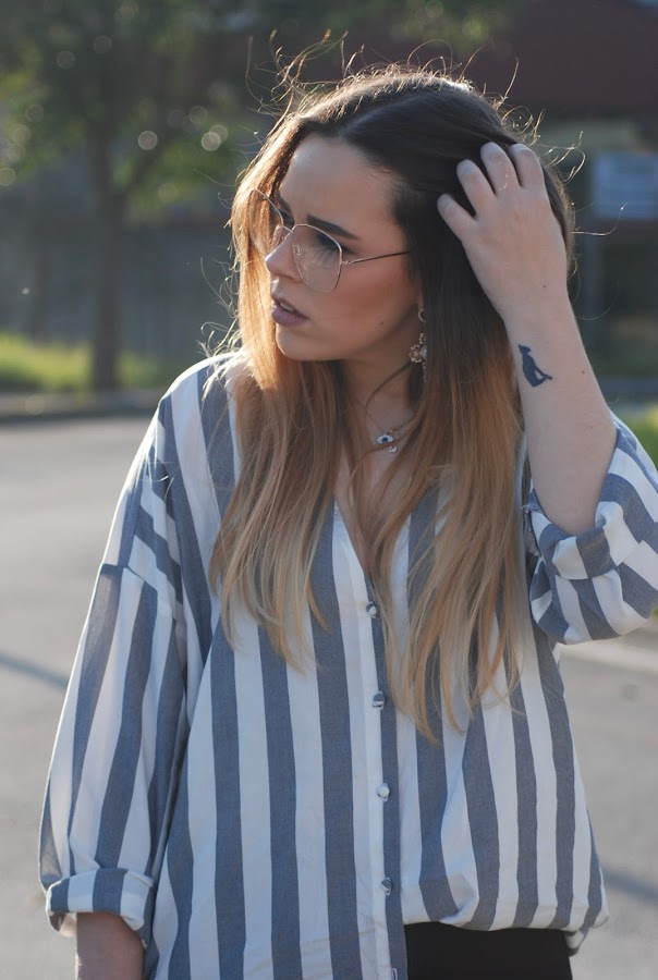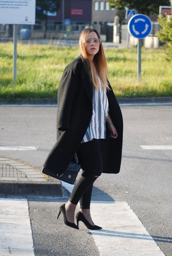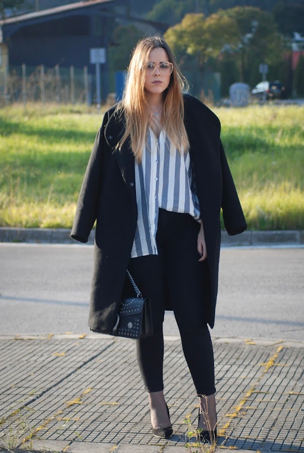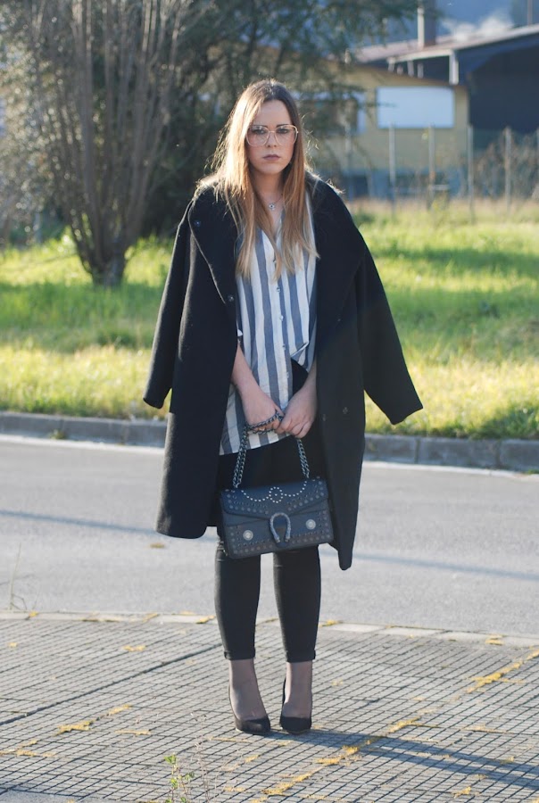 Aproveche que hacía buen tiempo para estrenar mi nueva camisa de rayas oversize. Fue verla en Zara y enamorarme de ella. También estrené zapatos (necesitaba unos nuevos stilettos negros) y abrigo (llevaba mil años buscando uno así y lo encontré en las últimas rebajas de Zara a un precio de risa). Todo esto lo combiné con jeans negros y el bolso que os enseñé en el post anterior (podéis verlo aquí) de inspiración Gucci. Como complementos maxi pendientes de cruces, collar con un ojo de la mala suerte (regalo de cumple del año pasado que me tiene loca), anillo super sencillín en color dorado y gafas de pega (si, soy de esa gente que usa gafas fake).