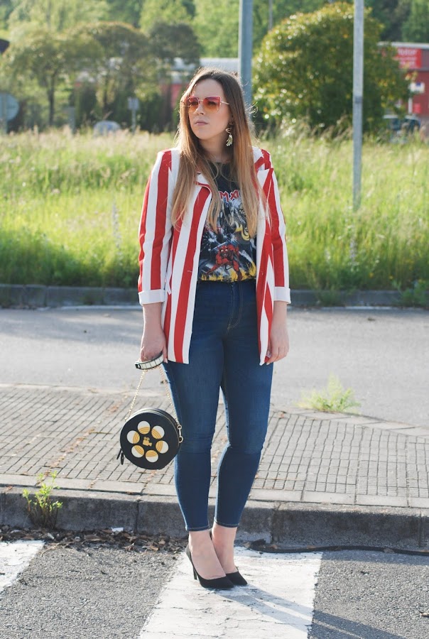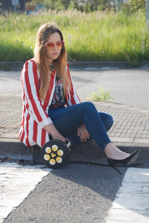 Para combinarlo una de mis camisetas favoritas, jeans azules, zapatos negros y mi bolso rollo de película de cine que me tiene loca. Por cierto, si a vosotras os gusta tanto como a mi corred a mi Instagram porque estoy sorteando uno igualito (podéis participar ).