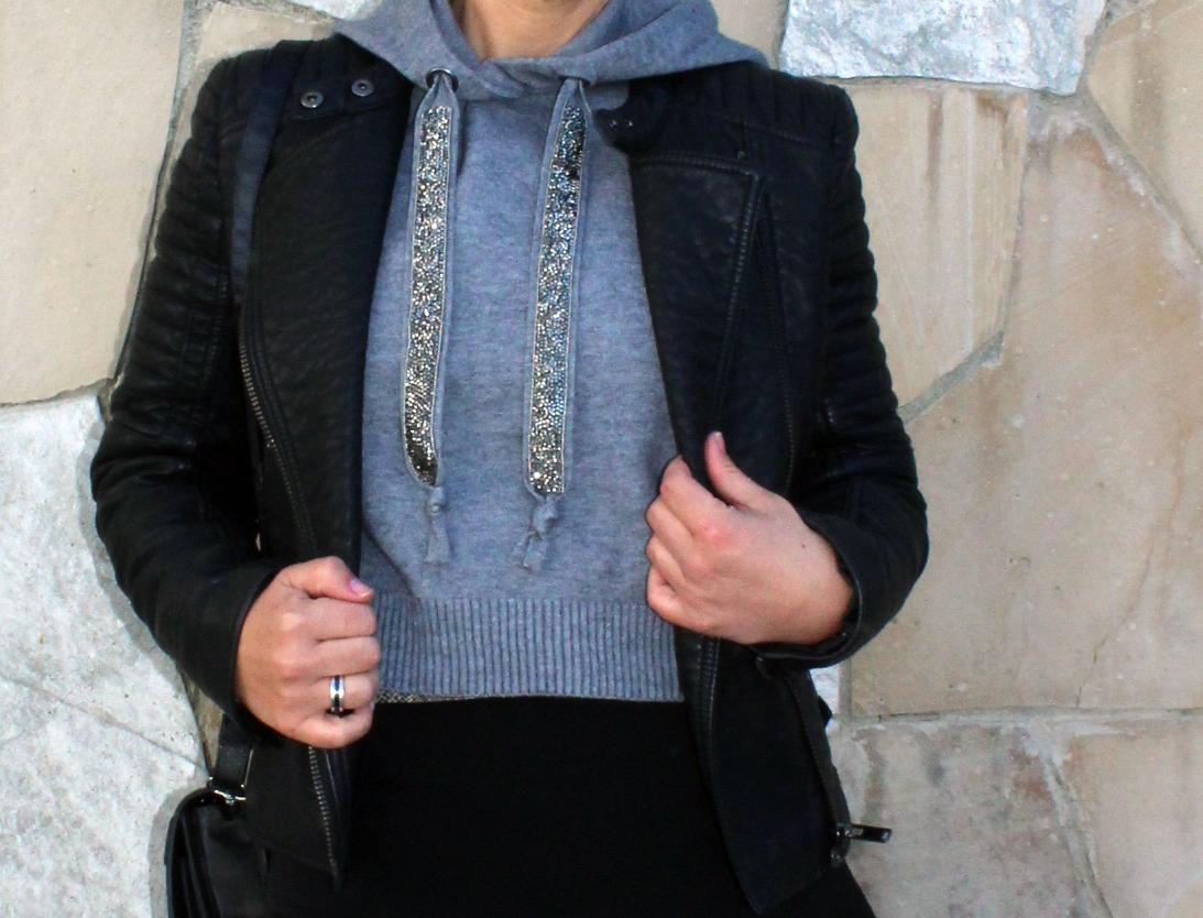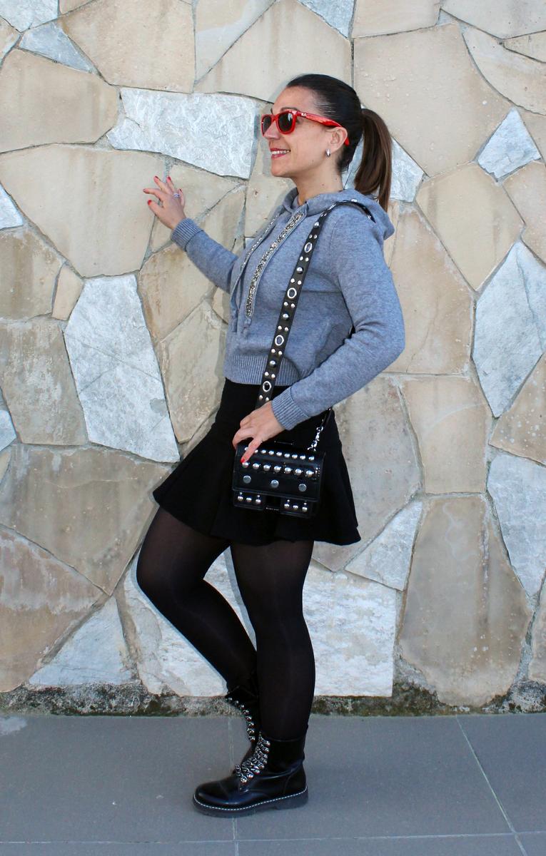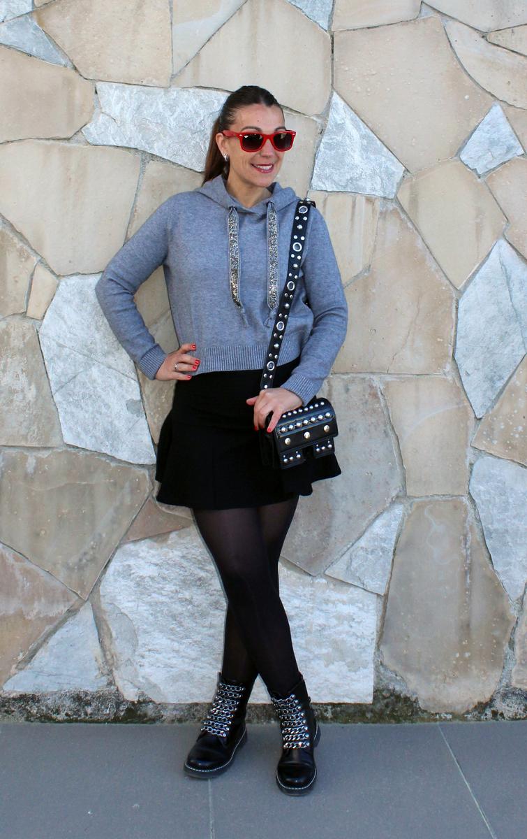 El outfit lo monté a partir de la sudadera en color gris, cortita, con capucha y unos bonitos lazos delanteros recubiertos de una especie de purpurina, pero después fui añadiendo más cosas que relucen, como son las botas con cadenas y el bolso con tachuelas, como os decía pequeñas pinceladas de brilli brilli.