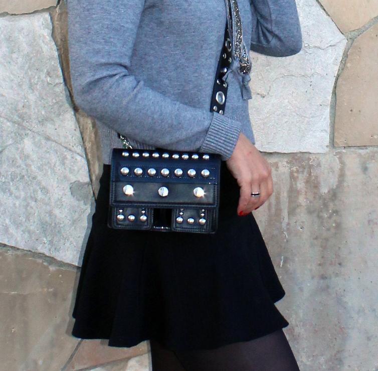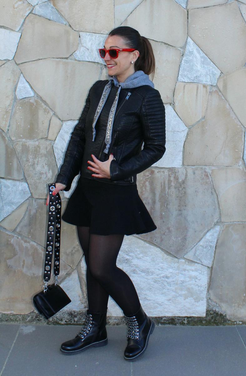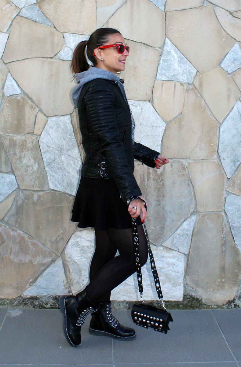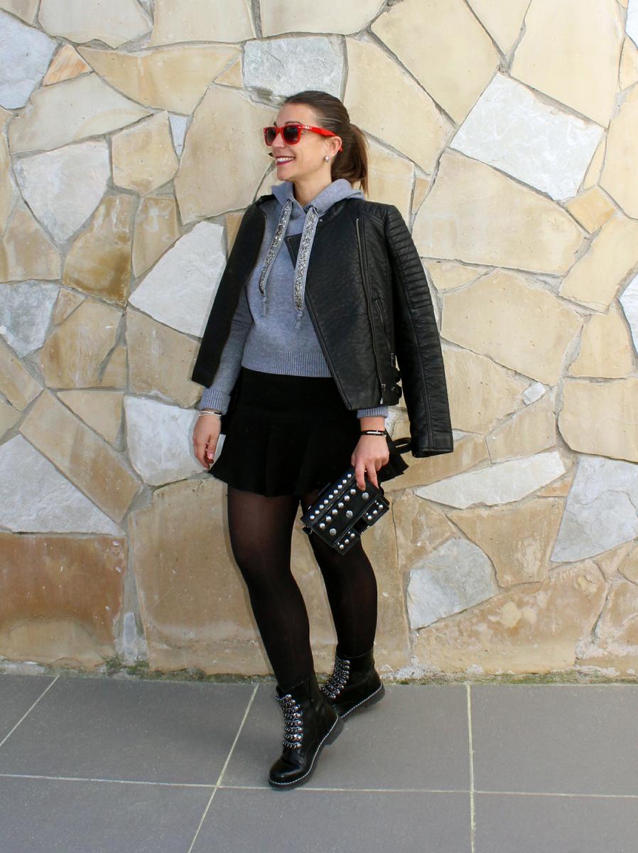 El outfit lo monté a partir de la sudadera en color gris, cortita, con capucha y unos bonitos lazos delanteros recubiertos de una especie de purpurina, pero después fui añadiendo más cosas que relucen, como son las botas con cadenas y el bolso con tachuelas, como os decía pequeñas pinceladas de brilli brilli.
