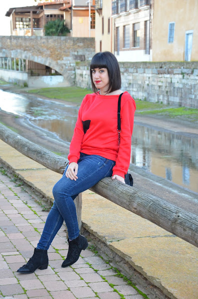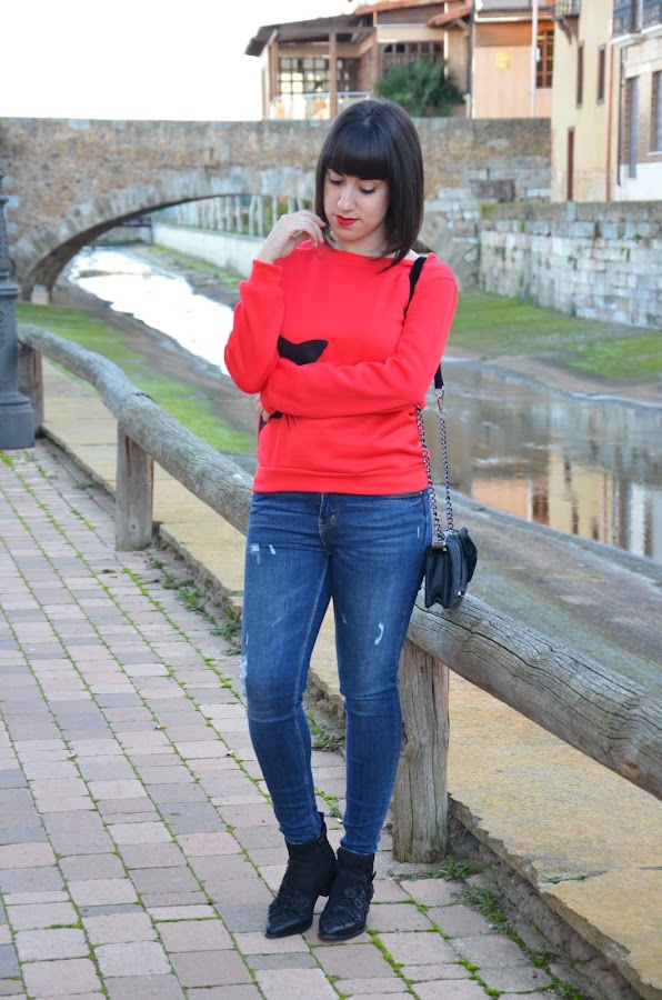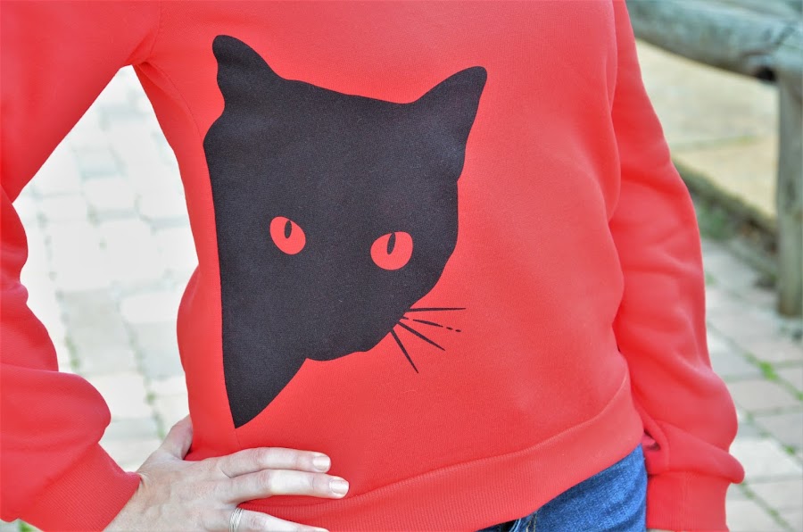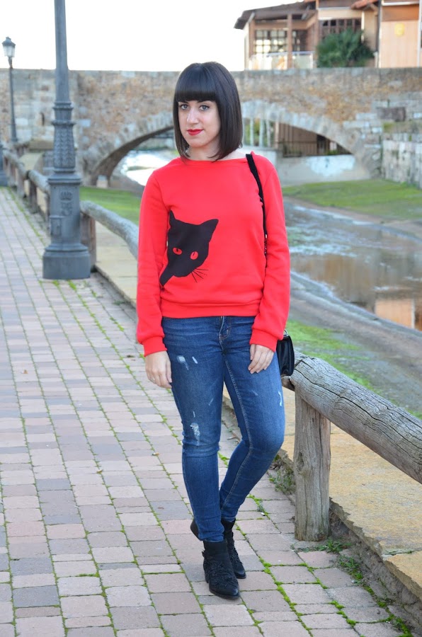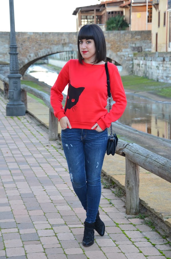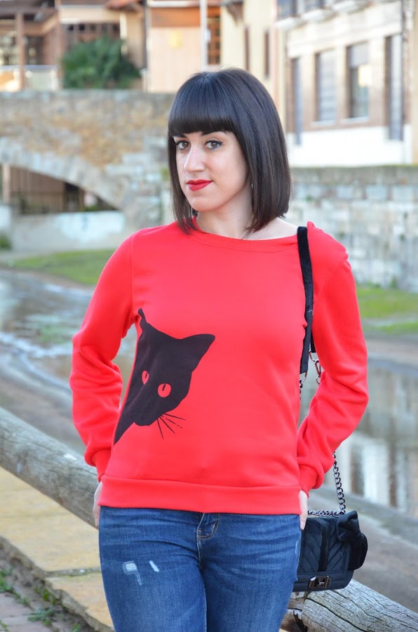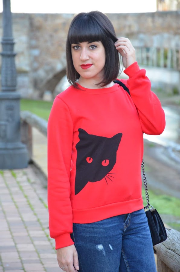 Hoy os traigo un look casual donde la indiscutible protagonista es esta original sudadera roja con un gato negro. Es muy llamativa y aunque la tela tiene un tacto un poco extraño es muy amorosina.
