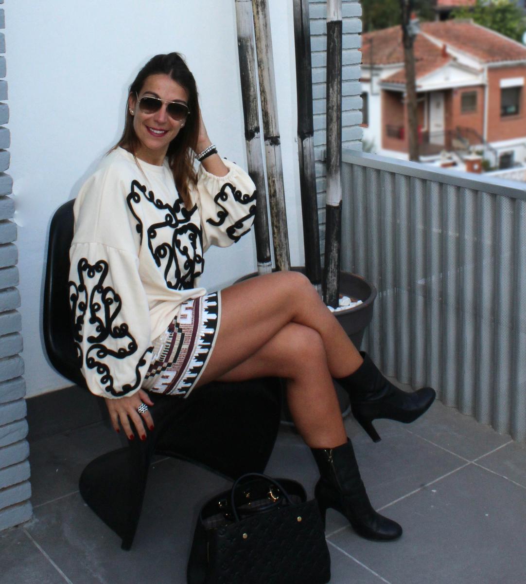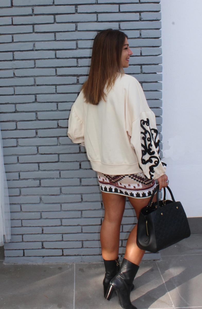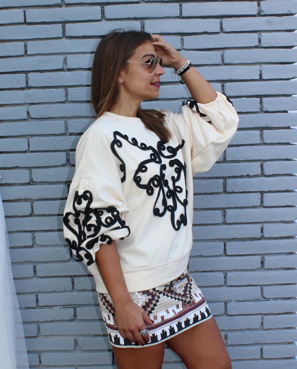 En mi look de hoy llevo una en color crema, con mangas abombadas, decorada con ribetes negros en terciopelo tamaño XXL, combinada con una falda estilo étnico en tonos negro-beige y burundy. Aunque la sudadera ya es recargada, la idea de NO combinarla con una prenda lisa, como sería de esperar, me hacía gracia, y arriesgar a conjuntarla con otro estampado potente. A los pies para subir un punto el lado chic, opté por botines de tacón y bolso de mano.